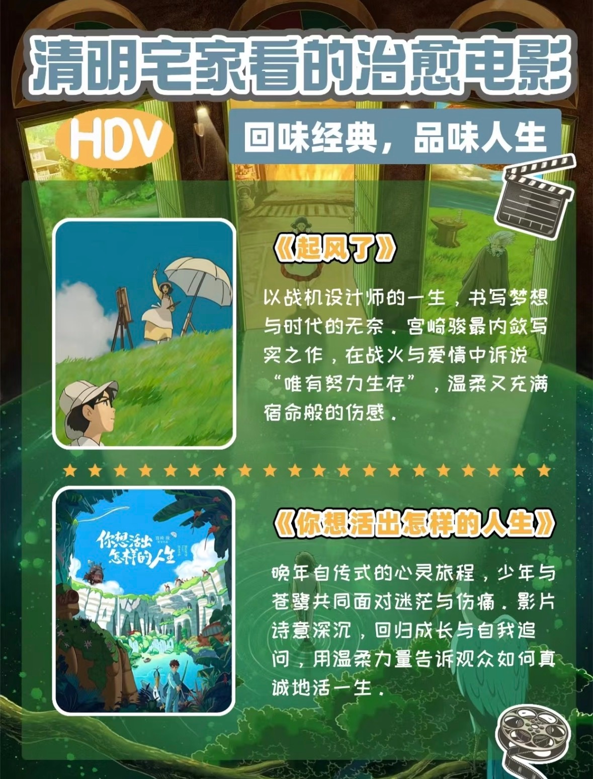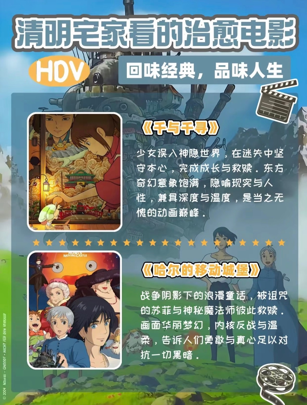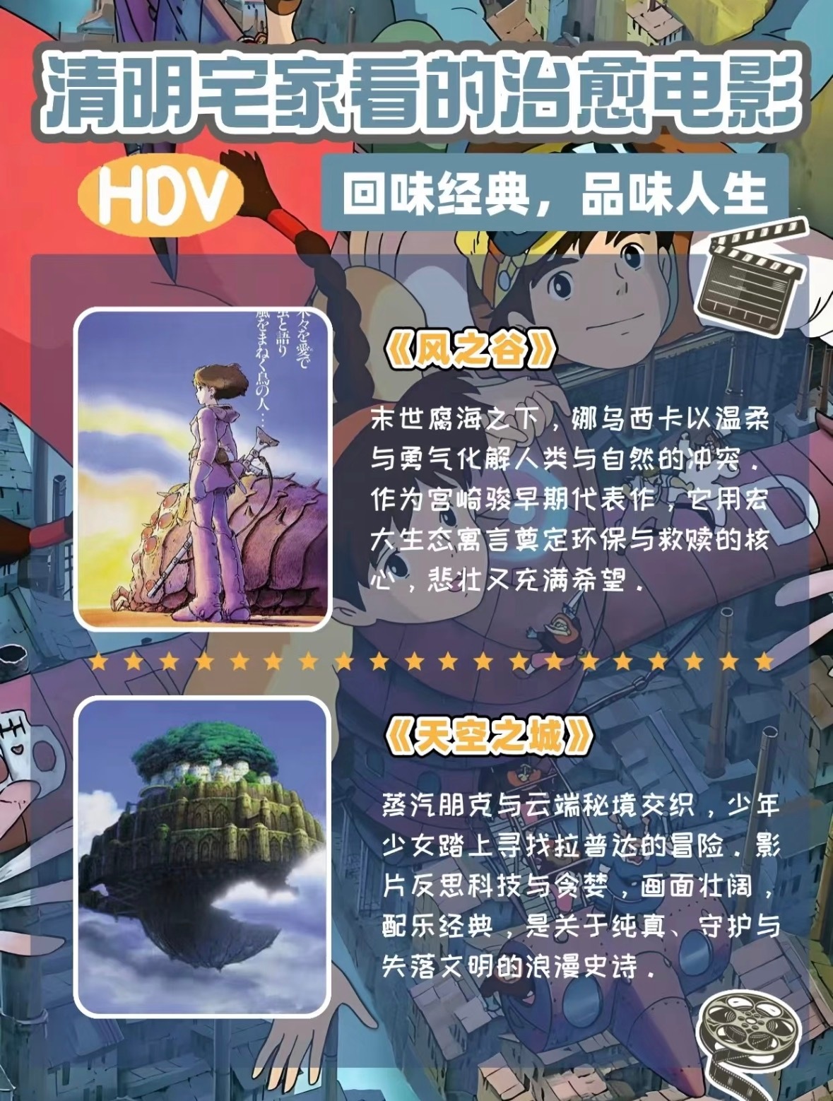 清明宅家看治愈电影——宝藏篇动漫点评团海外动漫名场面 这八部宫崎骏作品,之所以值得反复观看,是因为它们不只是动画,更是写给所有人的人生寓言:从《风之谷》的末世救赎到《天空之城》的理想与失落,从《龙猫》纯粹的童年温柔,到《幽灵公主》沉重的人与自然之思;《千与千寻》教我们在迷失中守住自我,《哈尔的移动城堡》让我们在混乱世界里依然相信爱与勇气,《起风了》以梦想照进现实的无奈与坚韧,而《你想活出怎样的人生》则用一生回望,追问活着的意义。它们用最治愈的画面,讲最深刻的道理——关于成长、善良、环保、反战,以及如何面对这个不完美的世界。无论几岁,都能从中看见自己、被治愈、被点亮!