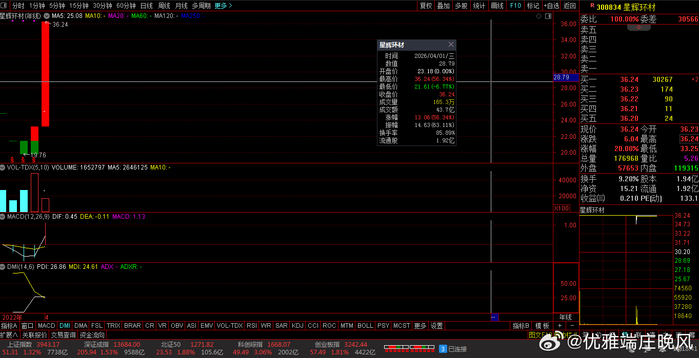 收盘价:36.24元。涨跌幅:20.00%。股票连涨:3天。