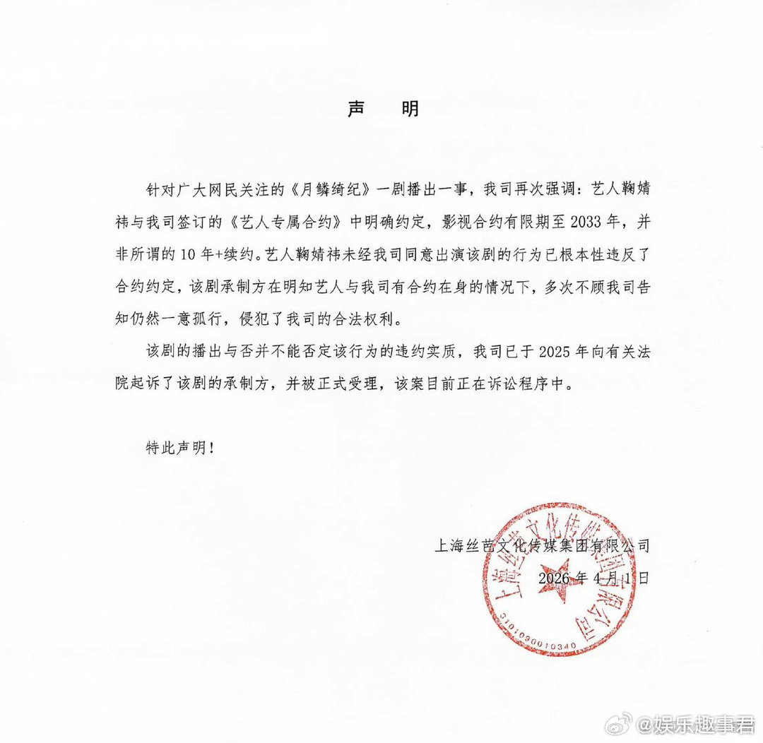丝芭起诉月鳞绮纪承制方丝芭传媒发声明称已起诉月鳞绮纪承制方,并再次强调了鞠婧祎的