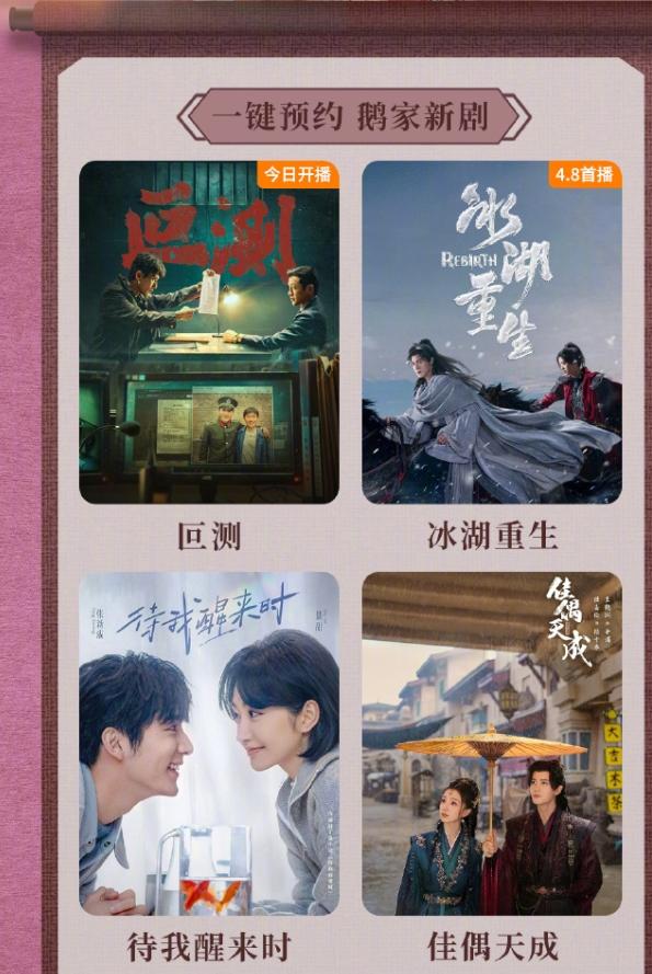 鹅厂四月排播! 鹅厂这边除了正在播的《白日提灯》之外,李昀锐和黄杨钿甜的《冰湖重