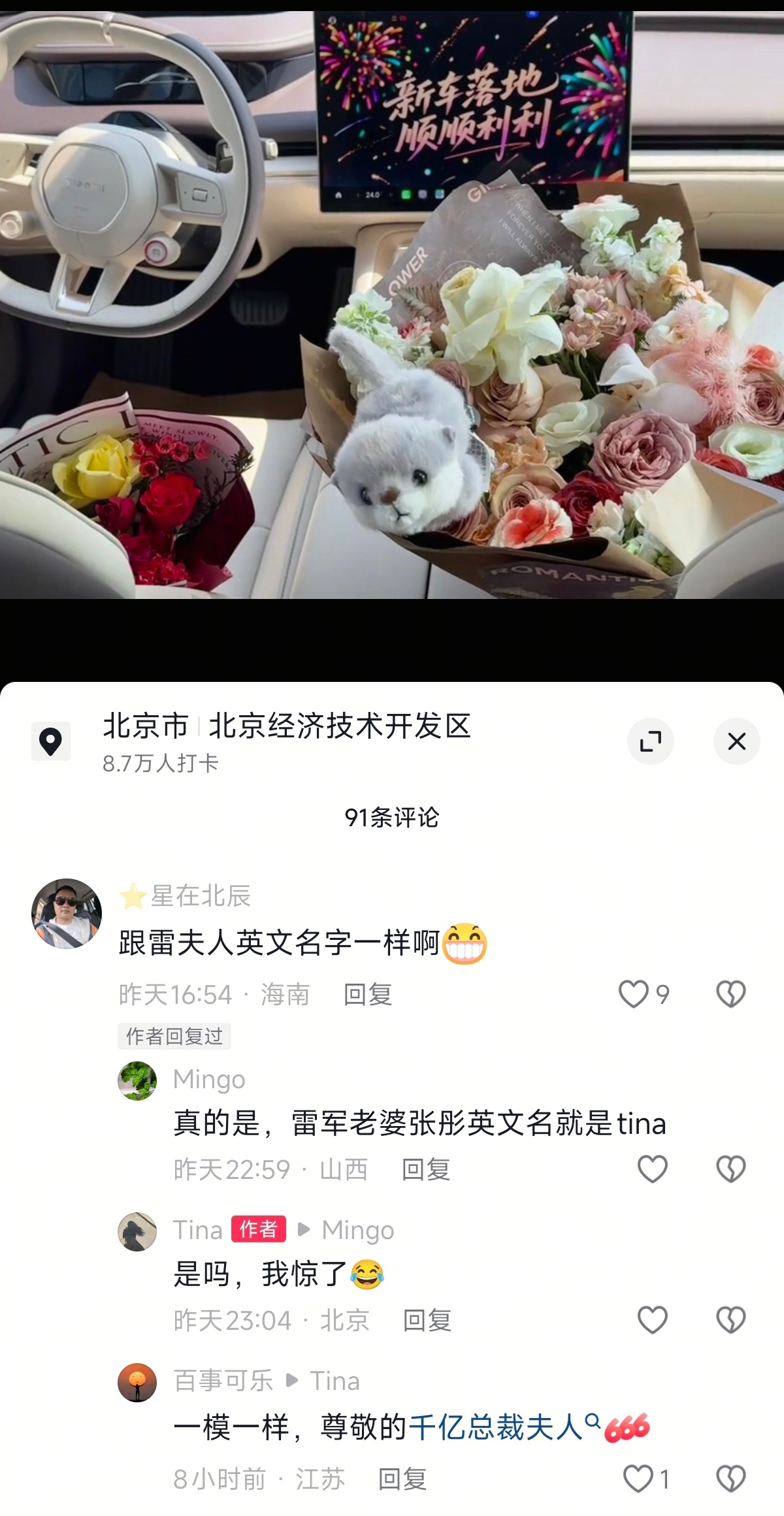 一位刚提车的小米车主,英文网名叫:Tina评论区网友:跟雷夫人英文名一样。小米汽