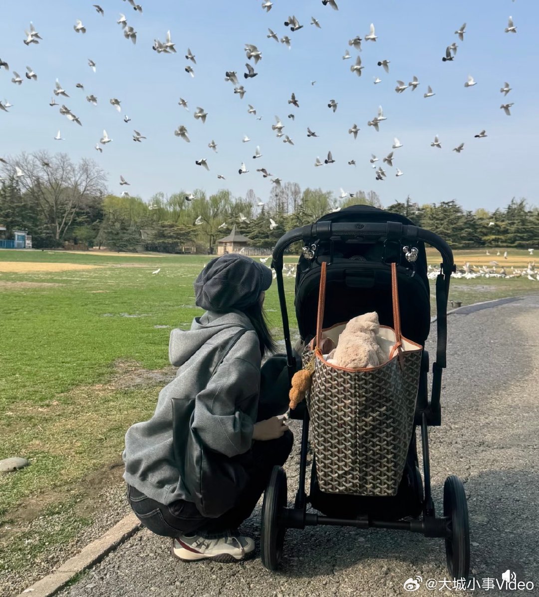 【何穗晒带娃照】何穗带娃看小动物 4月1日,在社媒分享带宝宝出门的照片,好温馨!