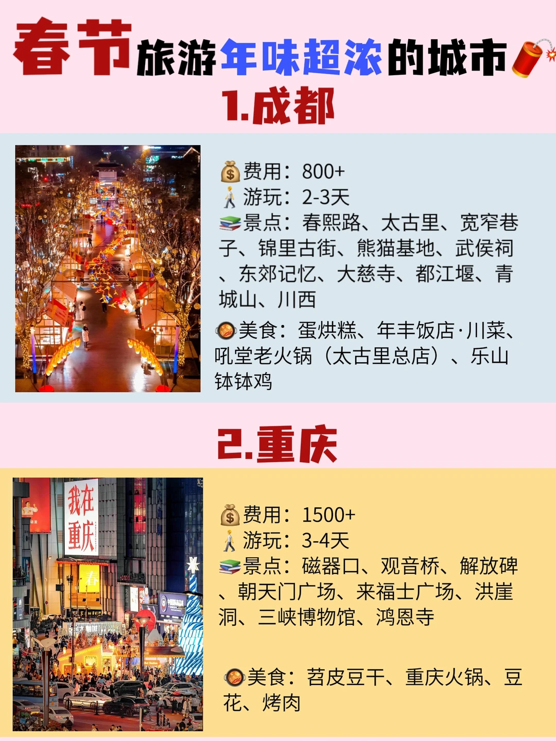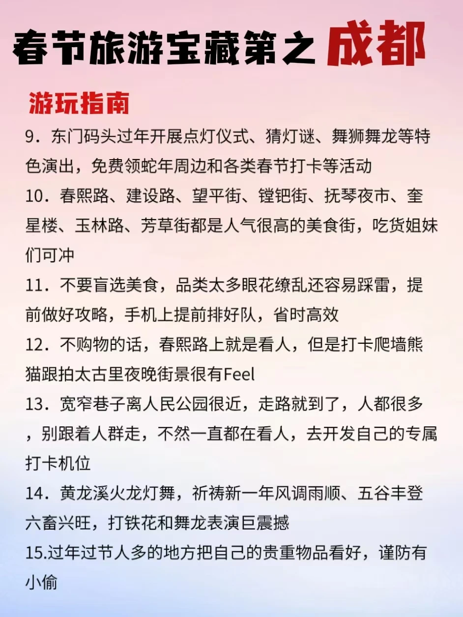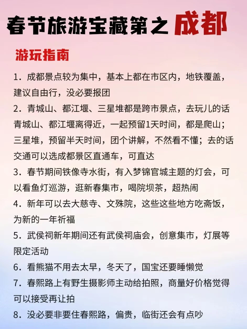 春节小长假想去旅游的宝子看这篇,专门给大家整理了一些年味比较浓的热门城市!跟着玩不踩雷! - 年味超浓的八个城市:成都、重庆、广州、潮汕、北京、哈尔滨、杭州、佛山 - ❤成都三日旅游行程 路线推荐 day1:熊猫基地﹣文殊院﹣人民公园﹣宽窄巷子﹣抚琴夜市 day2:成都博物馆﹣东郊记忆﹣大慈寺﹣春熙路﹣镗钯街﹣九眼桥 day3:杜甫草堂﹣青羊宫﹣武侯祠﹣锦里﹣玉林路 - 😍成都美食推荐 👉吼堂老火锅(太古里总店) 👉年丰饭店·川菜 - 伴手礼-