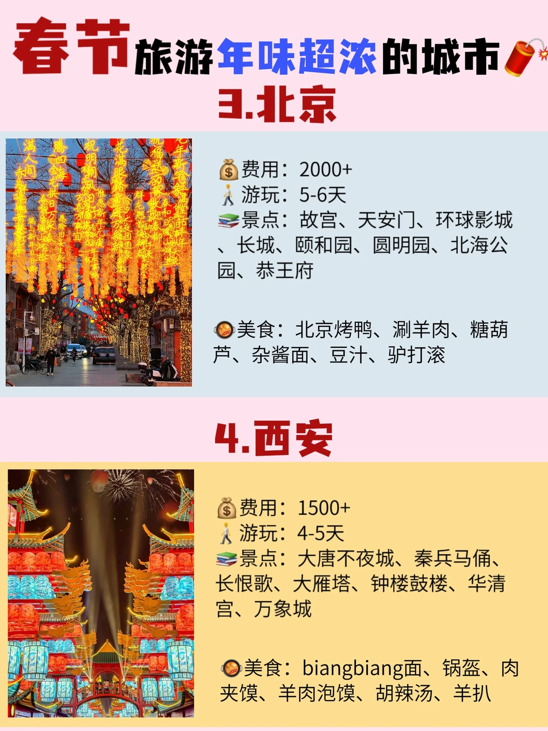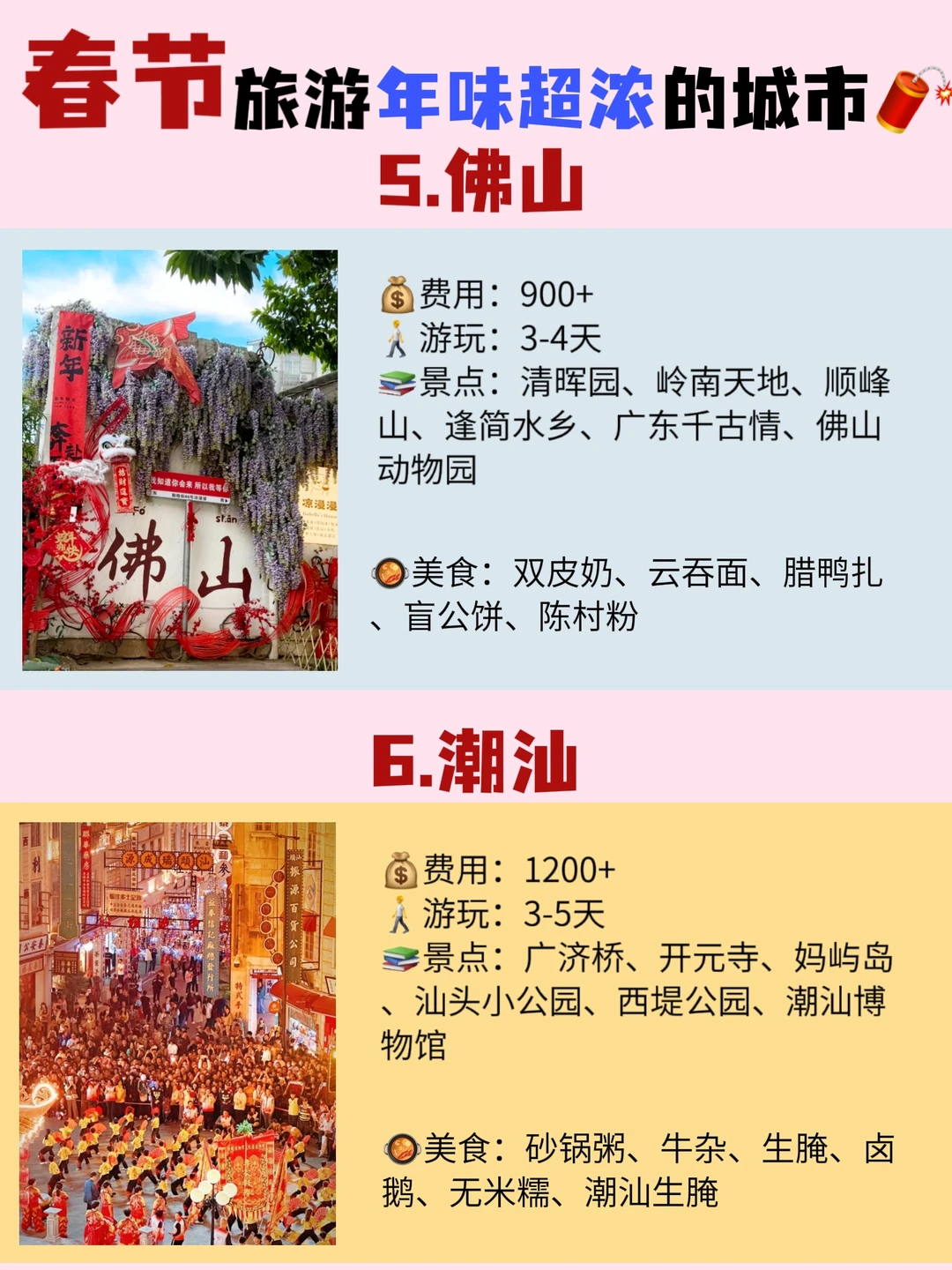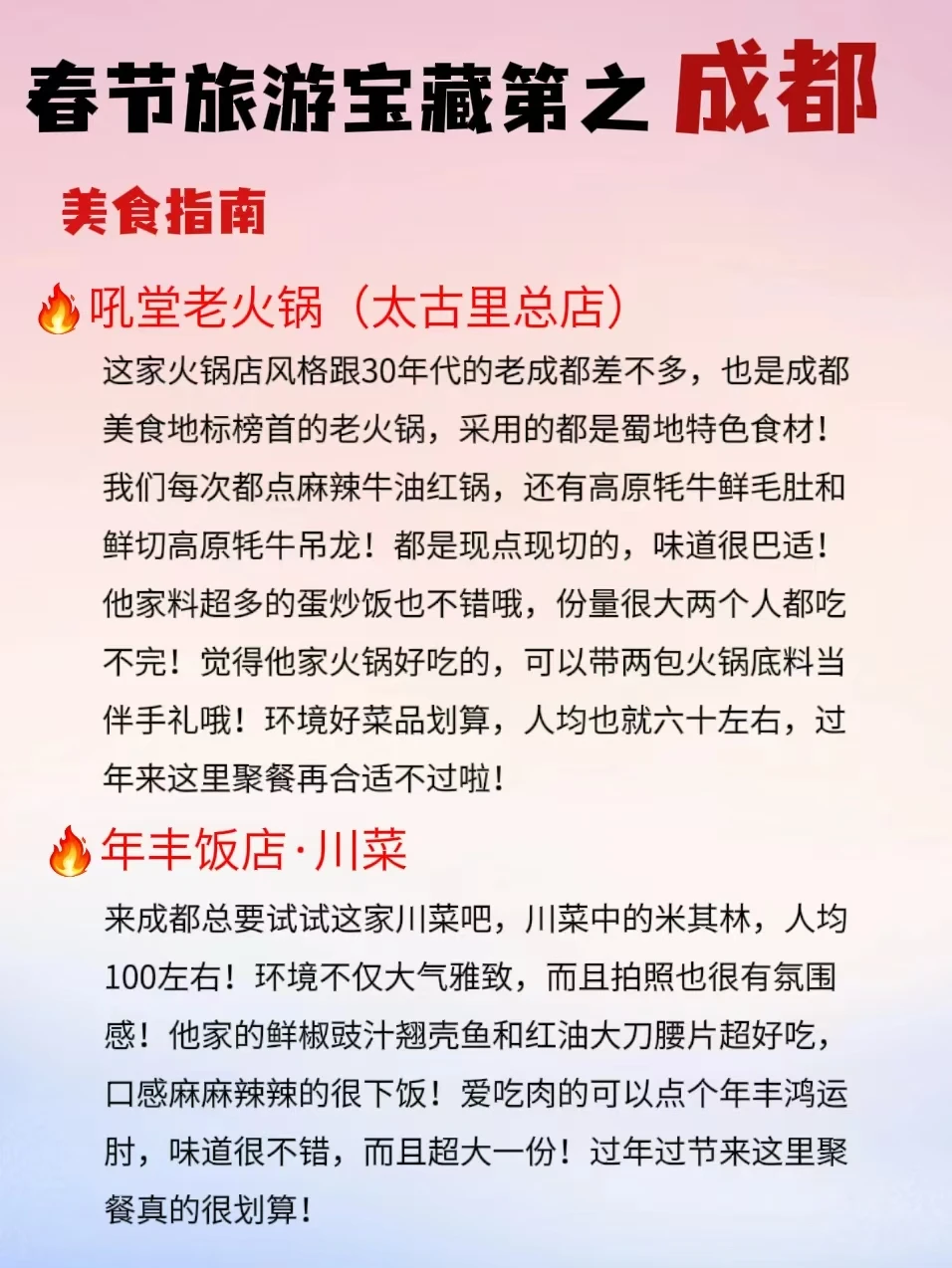 春节小长假想去旅游的宝子看这篇,专门给大家整理了一些年味比较浓的热门城市!跟着玩不踩雷! - 年味超浓的八个城市:成都、重庆、广州、潮汕、北京、哈尔滨、杭州、佛山 - ❤成都三日旅游行程 路线推荐 day1:熊猫基地﹣文殊院﹣人民公园﹣宽窄巷子﹣抚琴夜市 day2:成都博物馆﹣东郊记忆﹣大慈寺﹣春熙路﹣镗钯街﹣九眼桥 day3:杜甫草堂﹣青羊宫﹣武侯祠﹣锦里﹣玉林路 - 😍成都美食推荐 👉吼堂老火锅(太古里总店) 👉年丰饭店·川菜 - 伴手礼-