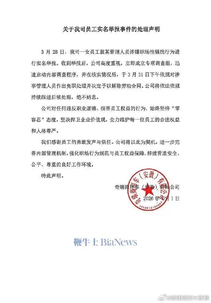 奇瑞商用车员工举报高管性骚扰奇瑞这次处理的挺快挺好的保护女性职场权益!!!