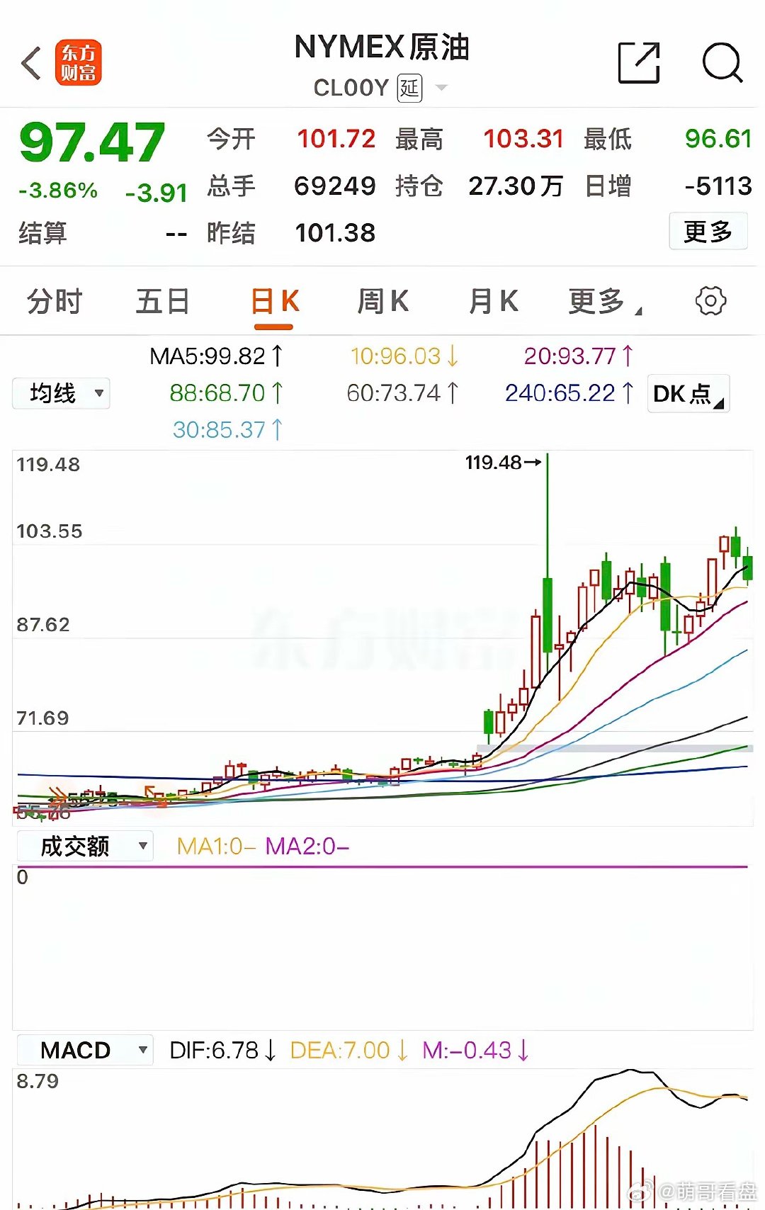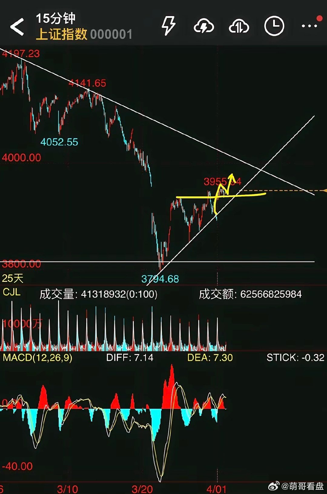 明天大盘将选择方向?大概率选择向上。理由很简单:①上证指数明天只需突破今日K线高点就会在15分钟周期形成突破回踩再突破的经典做多形态,目标3937-3852+3937=4022,或者下降趋势线。②创业板指收在15分钟下降趋势线附近,频繁靠近下降趋势线是突破的前兆。③原油下午已大幅回落,离20天均线94一步之遥,市场开始选择相信战争结束。所以,如果明天大盘选择向上突破的判断正确,那么:①夜盘原油最好收在20天均线之下。②上证指数明天盘中不能跌破3935。选择向上会加速吗?应该不会,靴子并未落地。靴子落地会加速吗?不一定,需要边走边看,加速表明做多动能强劲那就是5浪上涨概率大,不加速表明是B浪反弹。那明天要追涨吗?①短线关注涨跌家数这个指标,今天超四干只个股上涨,一般也就是二三天普涨会普跌一二天。明天如果个股普涨,则后天个股可能普跌,所以,要想成功率高可以用这个指标踏准市场节奏。②做大形态即将突破或者刚刚突破的个股,这类股大盘影响小。