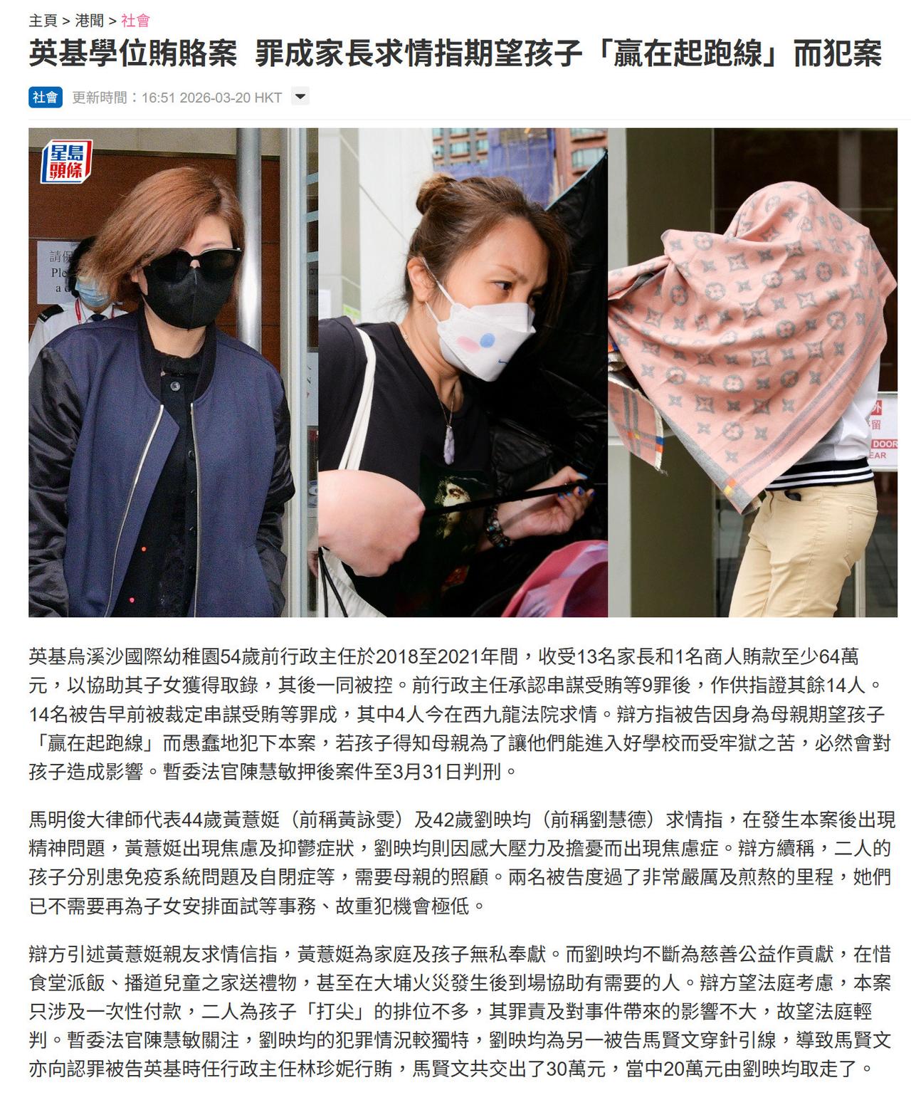 13位家长贿赂香港幼稚园全部被判刑。 13位家长加一位家长朋友,在2018年至2021期间,向香港英基乌溪沙国际幼稚园前行政主任林珍妮贿赂至少64万元,以让他们子女插队入学。 这些家长不乏高学历的人士,有包括英国法律毕业、清华毕业、儿童心理学博士等。她们在求情时均以「希望孩子赢在起跑线」、「孩子需要照顾」、「已患上焦虑抑郁」为由,希望轻判。 暂委法官陈慧敏指,明白父母望子成龙和赢在起跑线,但大前提是要守法,本案严重破坏入学制度公平性,判14人入狱8至14个月。