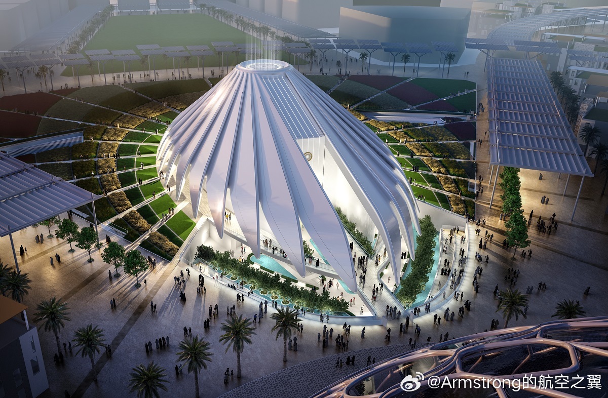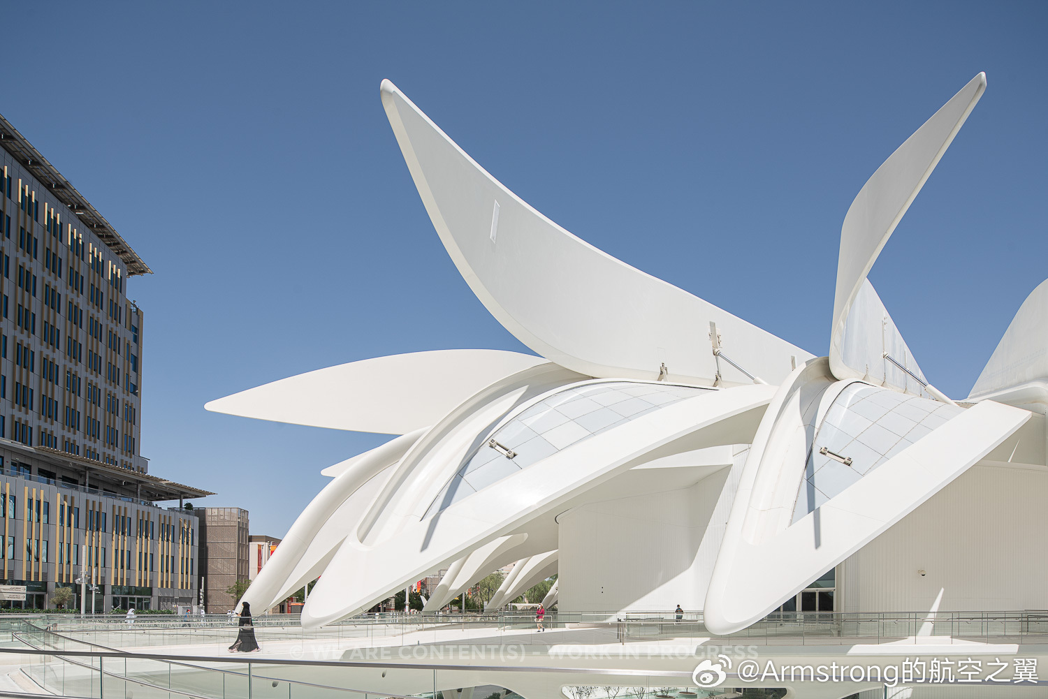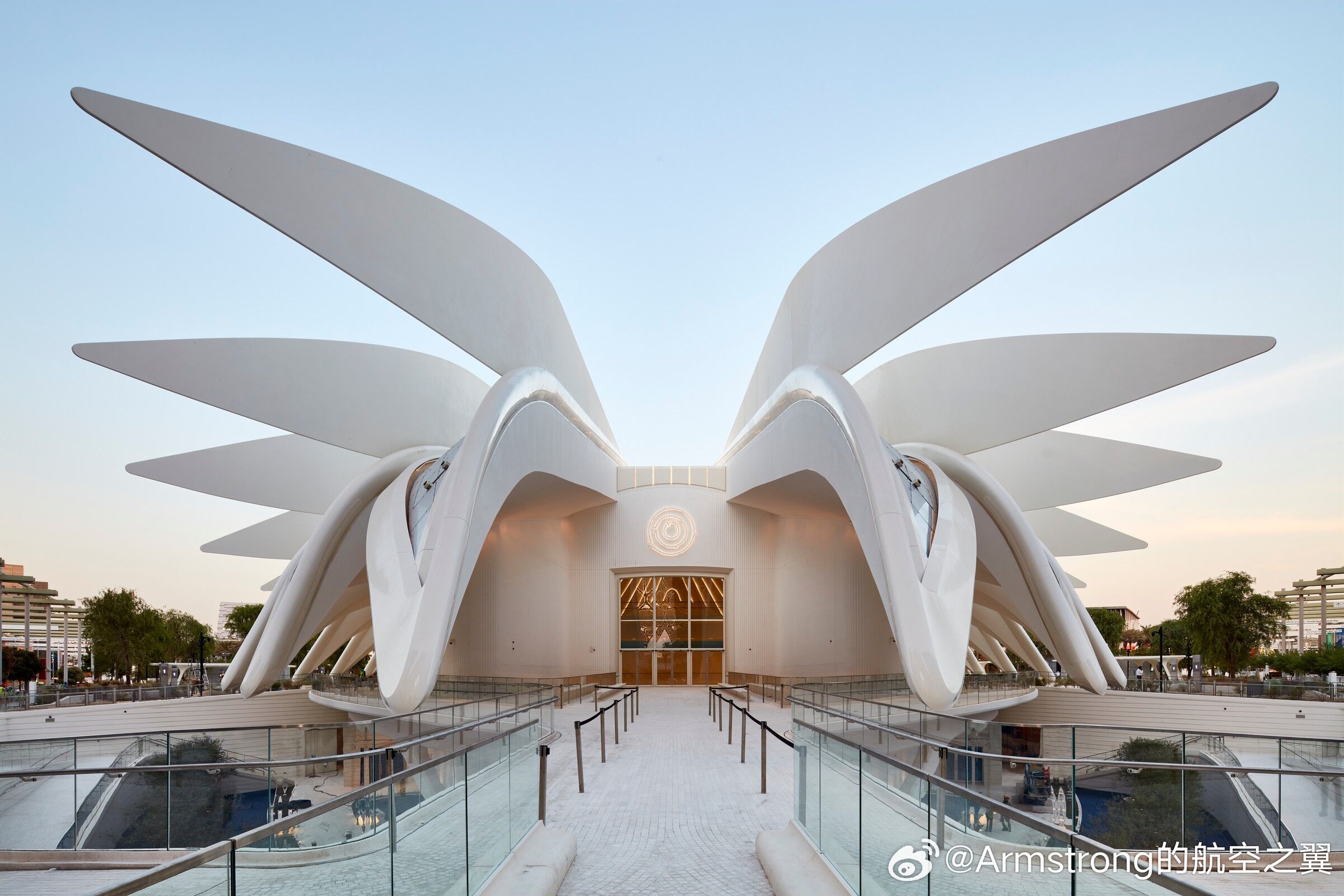 这个名为“猎隼” (The Falcon) 的阿联酋国家馆,设计出自西班牙建筑大师圣地亚哥·卡拉特拉瓦(Santiago Calatrava)之手。