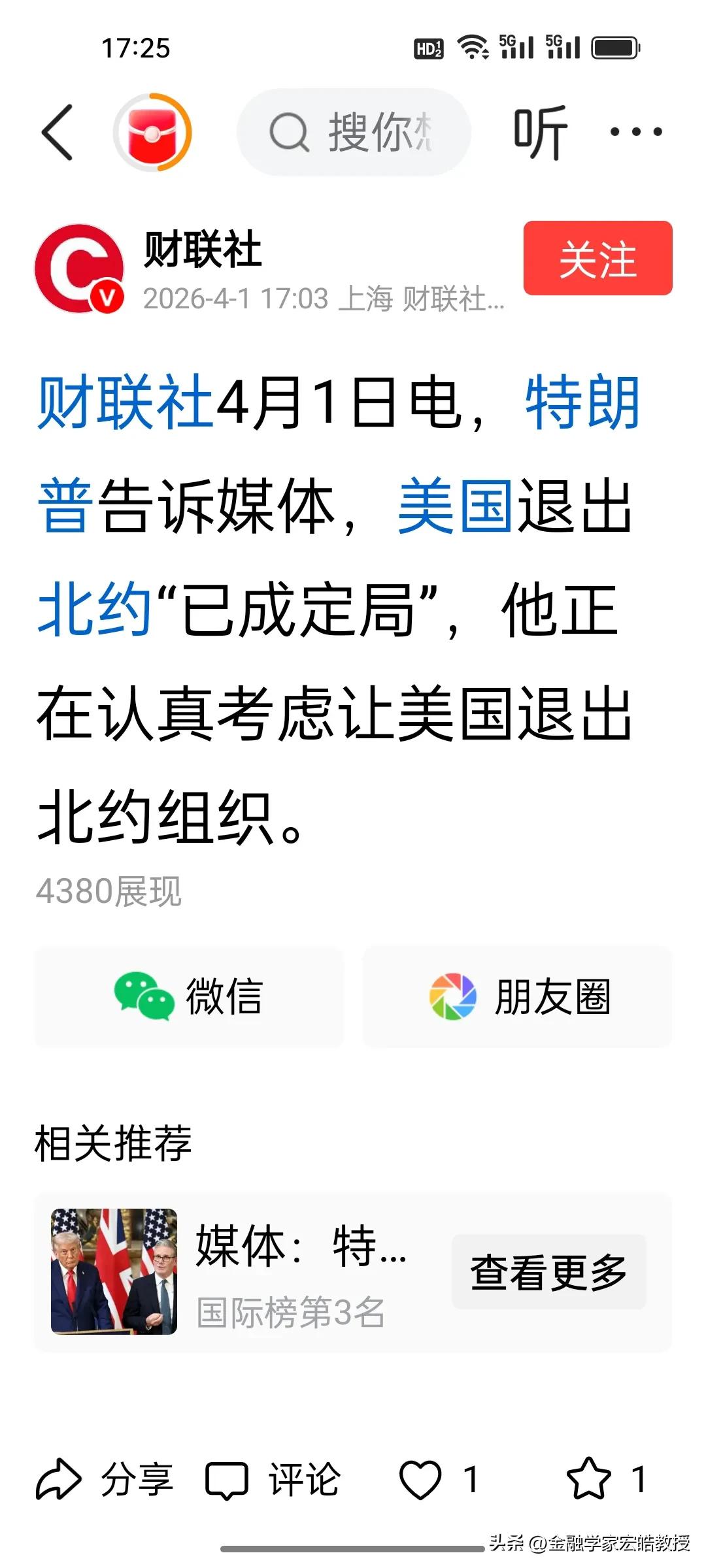 刚刚,根据新华社报道,特朗普突然官宣退出北约“已成定局”,全球格局迎来大地震!这不是威胁,是美国战略转向的必然。 此次退约,特朗普直接拿英国,法国等盟国在美伊问题上袖手旁观当借口,指责盟友关键时刻拒不相助,北约早已失去抱团价值。加之美国长期承担北约超七成军费,欧洲多国国防预算迟迟不达标,美国成了冤大头,这更是他退约的核心诱因,他不想让这些所谓的盟友占美国的便宜。 就在大家还在猜测特朗普之前放的退约狠话是不是又在极限施压时,新华社的报道直接打破了所有悬念,他这次是来真的,官宣退出北约“已成定局”,没有任何回旋的余地。 可能有人会觉得,这只是美国又一次拿捏盟友的手段,但只要稍微梳理一下最近的局势就会发现,这根本不是威胁,而是美国这些年战略转向的必然结果,背后藏着的全是实打实的矛盾和算计,而且这场退约带来的连锁反应,恐怕会超出所有人的预期。 特朗普这次退约,明面上最直接的借口,就是英国、法国这些核心盟友,在美伊问题上全程袖手旁观,半点力都不肯出。 最近美国在中东针对伊朗的动作不断,不管是呼吁盟友一起参与霍尔木兹海峡护航,还是请求使用欧洲的军事基地部署防御系统、转运军事物资,大多都被泼了冷水。 就拿法国来说,直接拒绝装载美国军事物资、飞往以色列的飞机飞越其领空,哪怕以色列反复保证这些弹药只用于针对伊朗的行动,法国也没松口,这让特朗普憋了一肚子火。 不光是法国,西班牙的态度更加强硬,不仅拒绝美国使用境内的关键军事基地,还直接对参与对伊军事行动的美军飞机关闭了领空,美军飞机连飞越都不被允许。 英国首相斯塔默更是直接表态,伊朗战争不是英国的战争,绝不会被卷入其中,哪怕特朗普公开贬低英国“太老旧了,航母也是坏的”,英国也没有丝毫妥协。 意大利也跟着拒绝了美军飞机在西西里基地降落,理由是“符合现有国际协议”,明眼人都能看出来,这就是不想配合美国的对伊行动。这些盟友的集体“反水”,成了特朗普退约最直接的导火索,他直言,北约这种关键时刻没人帮忙的联盟,早就没有抱团的价值了。 但其实,美伊问题上的分歧只是压垮骆驼的最后一根稻草,真正让特朗普下定决心退约的,是美国长期以来在北约里“吃亏”的委屈,这也是他反复提及的核心诱因。 可能很多人不知道,北约的军费分摊一直很不均衡,美国一个国家就承担了超过七成的军费,剩下的几十个成员国分摊不到三成。 而且特朗普早就要求欧洲盟友将军费提升到本国GDP的2%,可直到现在,还有很多国家连这个最低标准都达不到,更别说特朗普后来提出的5%的新要求了。 就拿西班牙来说,即便在北约峰会上被特朗普施压,也只承诺将国防开支提高到GDP的2.1%,比利时、斯洛伐克等国更是直接表示,短期内根本无法承受过高的军费目标。 特朗普不止一次在公开场合抱怨,美国每年花数千亿美元保护这些盟友,可到了自己需要帮忙的时候,却连个基地、一片领空都不肯提供,这不是让美国当冤大头是什么? 他多次强调,自己不想再让这些所谓的盟友,白白占美国的便宜,这种“付出与回报不对等”的不满,早就埋在了心里,只是一直没找到合适的时机彻底爆发。 很多人可能没注意到,特朗普这次官宣退约,其实早有铺垫。早在几个月前,他就多次在社交媒体上发文,指责北约是“纸老虎”,还说普京也知道这一点,甚至放话“美国是否退出北约,不需要国会就能决定”。 美国国务卿鲁比奥也提前帮腔,批评北约国家的表现令人失望,直言没有美国就没有北约,要是美国撤军,北约早就不复存在了。这些话看似是随口抱怨,其实都是在为这次正式退约铺路,暗示着美国对北约的耐心,早就耗尽了。现在特朗普官宣退约已成定局,全球格局的大地震已经开始酝酿。 要知道,北约自成立以来,一直是跨大西洋联盟的核心,也是美国把控欧洲、维持全球霸权的重要工具,美国一旦真的退出,欧洲的防务体系必然会陷入混乱,那些长期依赖美国保护的欧洲国家,不得不加快推进战略自主,重新调整自己的外交和安全策略。 而且这背后,还有美国战略重心东移的考量,放弃北约这个“包袱”,或许是为了把更多的资源投向印太地区,这其中的连锁反应,还在慢慢显现。 有人说,特朗普这次退约只是暂时的,等到后续利益谈妥,美国还会重新回到北约;也有人说,这是美国彻底放弃欧洲盟友、推行孤立主义的开始,全球地缘政治格局会因此彻底改变。 其实不管结局如何,这场退约都不是偶然,而是美国战略转向的必然,也是美欧之间长期矛盾的集中爆发。 那么大家觉得,特朗普官宣退出北约,到底是美国的战略算计,还是真的忍无可忍?欧洲盟友又会如何应对这场危机?欢迎在评论区说出你的观点。