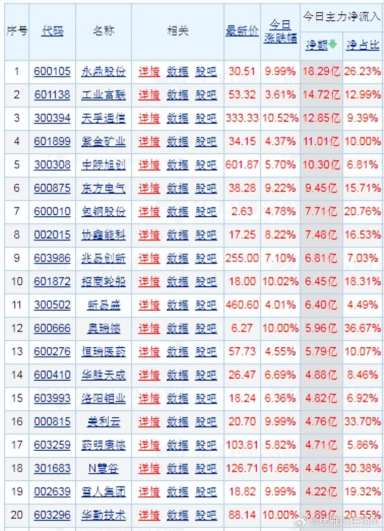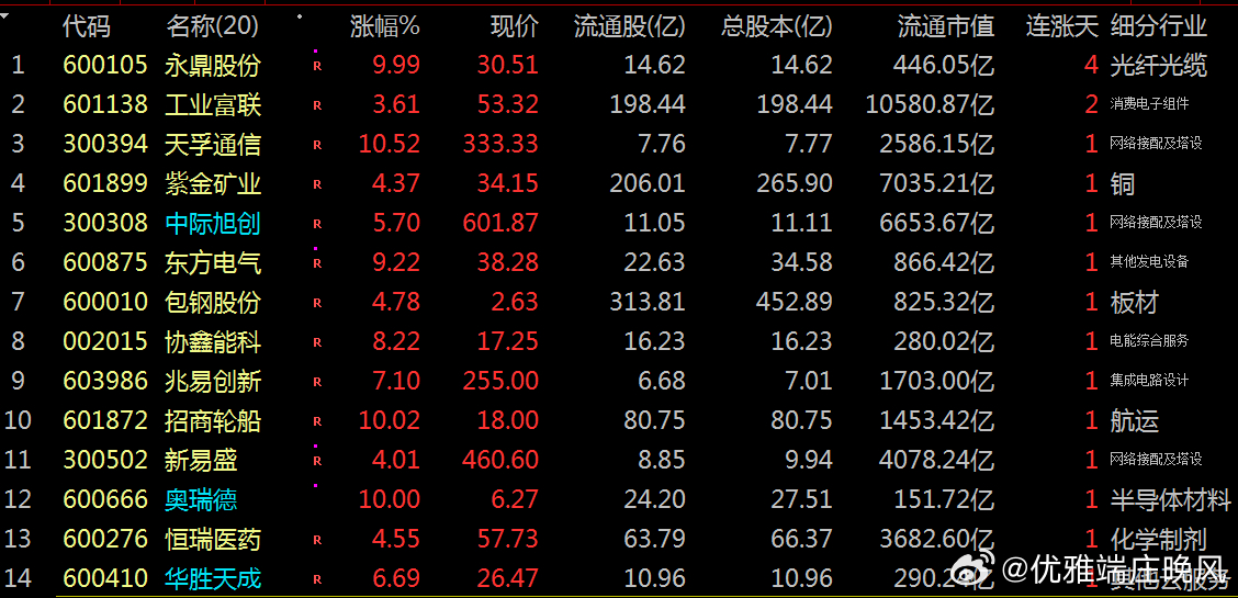 复盘潜龙:浮出水面。今日市场:个股普涨。其中永鼎股份、天孚通信等个股因行业热度、业绩预期或市场情绪驱动,推动股价上涨并带动市场人气,成为当日资金抢筹的焦点。今日透视:亦或梳理资金流向哪些龙头股: