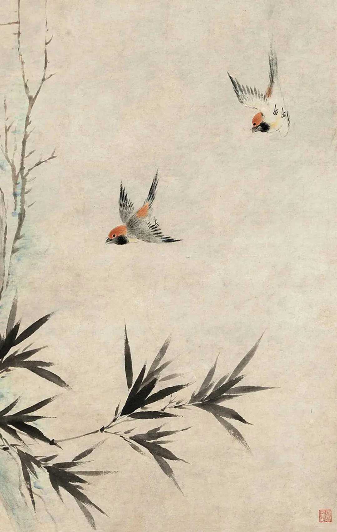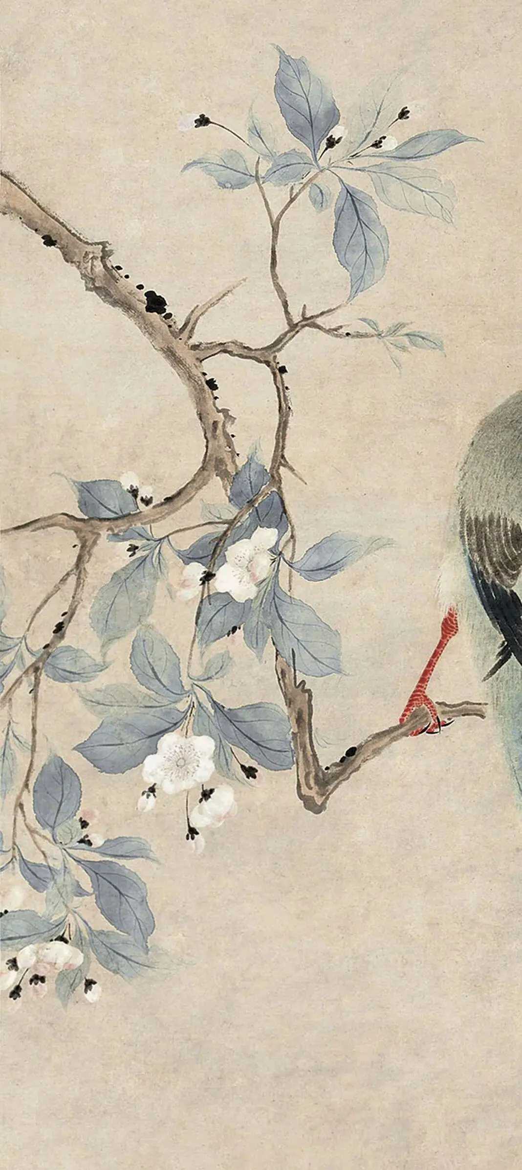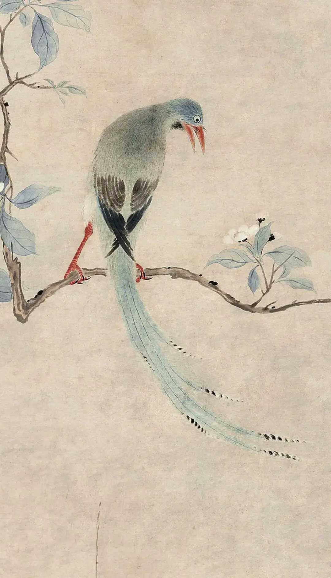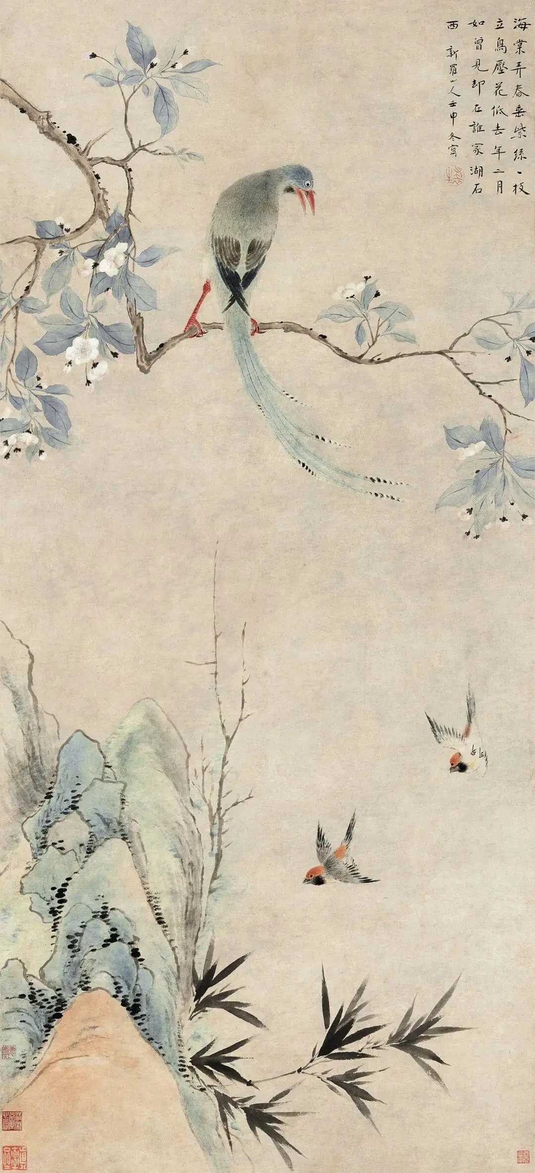 华喦《海棠弄春图》,纸本设色 133 × 61 cm。绘海棠一枝,横生斜出,花茂叶翠,春意正繁。一绶带高立枝头,回首与飞雀和鸣,姿态极为生动。其下崖石耸起,棘竹杂生。花鸟弄春,静极而动。遇见艺术这就是中国风