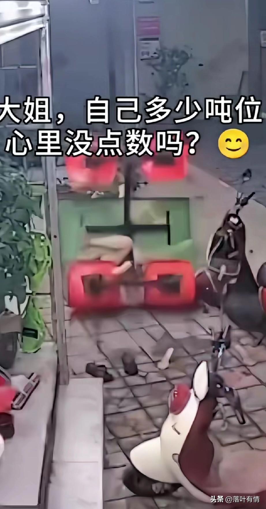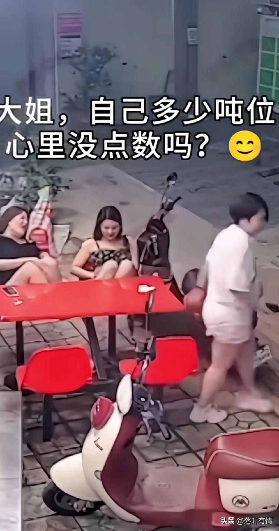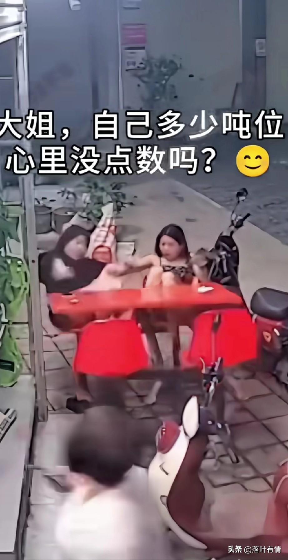 监控下的这一幕,把人逗乐了, 只见三个女孩坐在椅子上聊天, 没聊多久,坐在对面的女生就走开了, 只剩下两个穿着清凉的女生还坐在那儿,结果有一位体重非常重的大姐, 没有征兆的往后一仰, 结果整个椅子直接翻了, 坐在她旁边穿裙子的女生可倒霉了, 无缘无故受了这场灾难, 有人把这段视频放上了网, 结果把网友都逗笑了, 大家纷纷调侃, 大姐自己多少吨位心里没点数? 很多女生都是不清楚自己的吨位, 总觉得自己非常苗条, 结果发生这样的事儿, 你说好玩不好玩? 监控下的人一幕