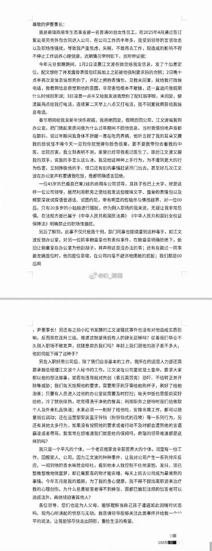 我在想一个问题,假如这位手握大权的奇瑞高管性骚扰的不是未婚的00后女员工,而是一个已婚的80后、90后,会发生什么?她们是否会为了工作,为了家庭,直接隐忍,不敢怒不敢言,更不敢举报?