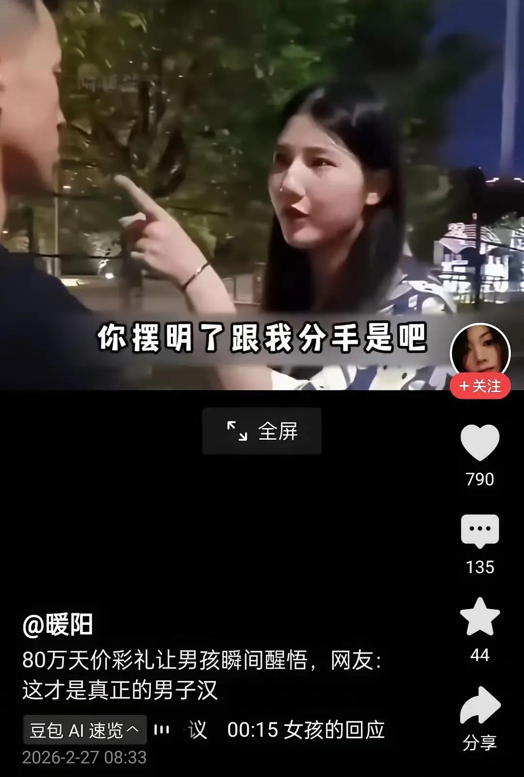 男子斥责女友,你有什么底气觉得80万彩礼不多啊?我一个月工资1万,不吃不喝要挣7年。 这话一出口,路边的空气瞬间凝固。女生的脸瞬间涨红,指着男生的鼻子质问,你摆明了跟我分手是吧?你就是不爱我了,拿彩礼当借口。 男生站在原地,语气没有丝毫退让。他说,我不是不爱你,是这份爱,不能用80万来标价。 我每个月1万的工资,是每天加班到深夜,跑客户、赶项目,一分一分熬出来的。不吃不喝攒7年,才能凑够这80万,我拿什么给你办婚礼?拿什么买婚房?拿什么养我们以后的孩子?难道要我掏空父母一辈子的养老钱,再背上几十万的外债,让我们一结婚就活在还债的日子里? 女生根本听不进去,只觉得男生在找理由。她反复强调,这是当地的行情,身边的姐妹结婚,彩礼都比这个数高,80万已经是给她留了余地,男生拿不出来,就是没本事,就是给不了她幸福。她还说,彩礼是给父母的养育费,是自己的身价,男生连这点钱都拿不出来,根本不配娶她。 男生看着眼前的女生,突然就彻底清醒了。他意识到,两个人从一开始,对婚姻的理解就完全不同。 女生把彩礼当成了爱的证明,当成了面子的筹码,当成了给父母的回报,却从来没考虑过他的实际情况,没考虑过两个人婚后的生活,没考虑过这笔钱会给两个家庭带来多大的压力。而他想要的,是两个人一起奋斗,一起攒钱,一起把小日子过好,不是用巨额彩礼,把两个人的未来压垮,把父母的晚年拖入困境。 他没有再跟女生争辩,只是平静地说,这婚,我不结了。说完,他转身就走,没有丝毫留恋。女生愣在原地,不敢相信男生真的会因为彩礼,跟她提分手,她还在原地喊着,你会后悔的,你再也找不到我这么好的女生了。 男生没有回头。他知道,自己做的这个决定,是对的。他不能为了所谓的爱情,掏空自己的一切,背负一辈子的债务,更不能让辛苦了一辈子的父母,跟着自己受苦,把养老钱都拿出来,换女儿的一场婚礼。 这件事传到网上,瞬间引发了全网的热议。无数网友留言,夸男生是真正的男子汉,清醒果断,不被天价彩礼绑架,不做彩礼的奴隶。很多人说,男生的做法,给所有被天价彩礼困扰的年轻人做了榜样,婚姻不是买卖,爱情不能用金钱衡量,不能为了结婚,就把自己和家人逼上绝路。 也有不少人替女生说话,觉得彩礼是女方的保障,是男方的诚意,80万不多,男生拿不出来,就是没本事。可更多的人明白,天价彩礼本身就是歪风陋习,是借婚姻索取财物,不仅违反了民法典的明确规定,更是给婚姻埋下了巨大的隐患。 根据《中华人民共和国民法典》第一千零四十二条,明确禁止借婚姻索取财物。近年来,全国多地都出台了移风易俗的政策,整治天价彩礼、大操大办等不良风气,就是为了遏制这种把婚姻当成交易的歪风,让婚姻回归爱情的本质,让年轻人不再被彩礼绑架,敢结婚、愿结婚。 很多年轻人,在谈婚论嫁的时候,都被彩礼问题困住。有的人为了结婚,掏空父母的养老钱,借遍亲戚朋友,婚后两个人一起还债,日子过得苦不堪言,原本的感情也在柴米油盐的还债中,消耗殆尽,最后走向离婚。 有的人为了彩礼,谈不拢,直接分手,毁掉了多年的感情,留下一辈子的遗憾。还有的年轻人,因为天价彩礼,直接不敢结婚,不想结婚,导致生育率持续走低,成了社会的大问题。 男生的清醒,就在于他没有被爱情冲昏头脑,没有被所谓的“行情”绑架,没有被女生的道德绑架裹挟。他清楚地知道,自己想要的是什么,什么样的婚姻,才是适合自己的。他没有为了结婚,妥协于不合理的要求,而是果断止损,及时抽身,这才是对自己负责,对父母负责,对未来负责。 女生的问题,在于她被身边的攀比风气裹挟,被所谓的“彩礼行情”洗脑,把彩礼当成了衡量爱的唯一标准,却忽略了感情的本质,忽略了两个人的未来。 她以为80万的彩礼,能给她带来安全感,能给父母带来回报,可她没明白,真正的安全感,不是男方给的巨额彩礼,是两个人一起奋斗,一起创造的未来,是互相理解,互相体谅的感情。父母养女儿,不是为了卖女儿换钱,是希望女儿能过得幸福,而不是用女儿的婚姻,换取一笔高额的彩礼。 天价彩礼的歪风,不知道毁掉了多少原本美好的感情,毁掉了多少年轻人的婚姻,毁掉了多少普通家庭的幸福。 很多父母,为了面子,逼着女儿要高额彩礼,把女儿当成了换取利益的工具,根本不管女儿婚后的生活,不管女儿会不会背负一辈子的债务。很多男生,为了结婚,不得不背负巨额债务,一辈子活在还债的压力里,喘不过气。 这件事给所有年轻人提了醒,谈婚论嫁的时候,一定要看清对方的三观,看清对方对婚姻的理解,不要被天价彩礼绑架,不要为了所谓的面子,毁掉自己的一生。真正的爱,不是用金钱来衡量的,是两个人一起,把小日子过好,是互相扶持,互相理解,是一起面对生活的风雨。 各位读者你们怎么看?欢迎在评论区讨论。