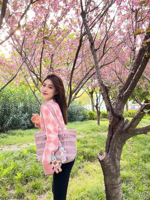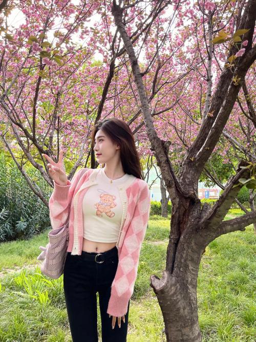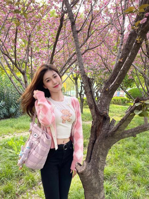 春日赏花,粉衣少女笑语如花映春光。粉裙花畔照 粉裙穿搭