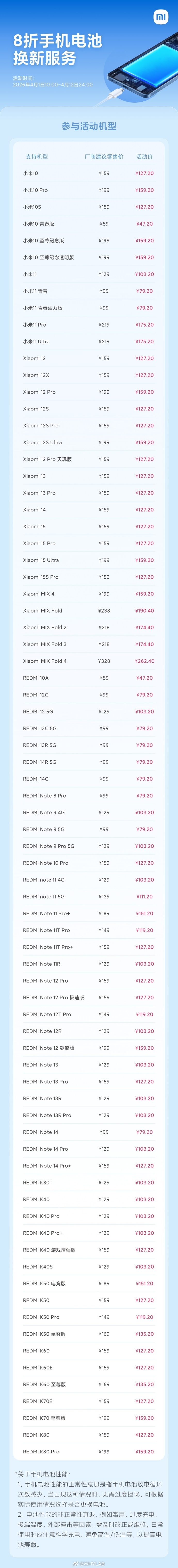 小米 4 月超级服务周来了,77 款手机电池换新 8 折,最低只要 47.20