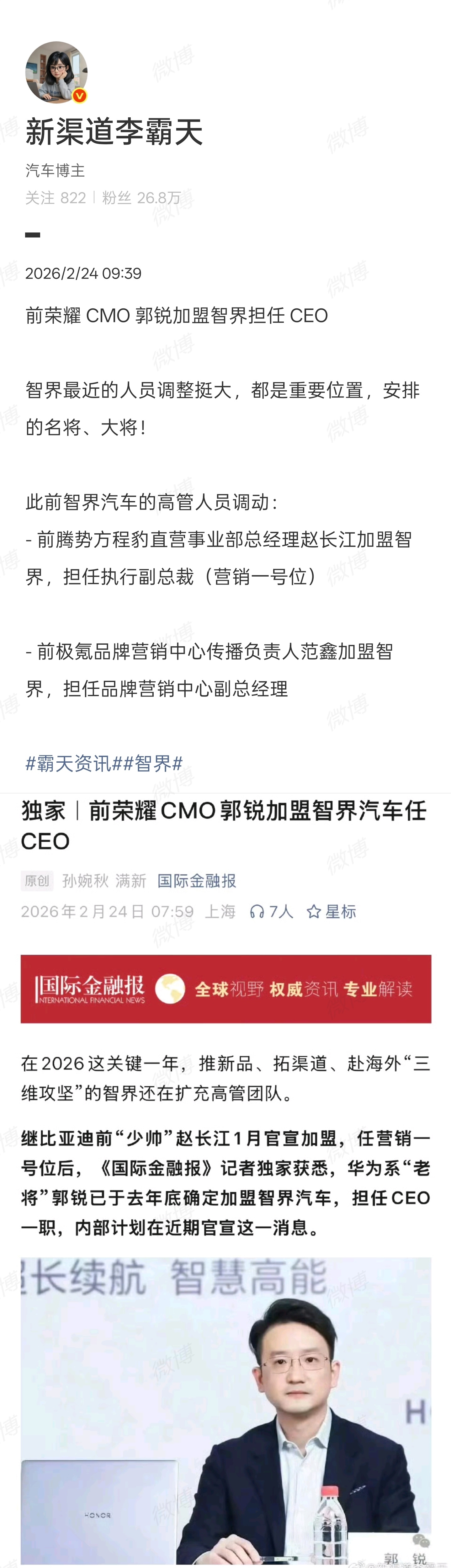 官宣了!加入智界,担任 CEO大家赶紧关注起来~智界目前团队非常强大啊霸天资讯