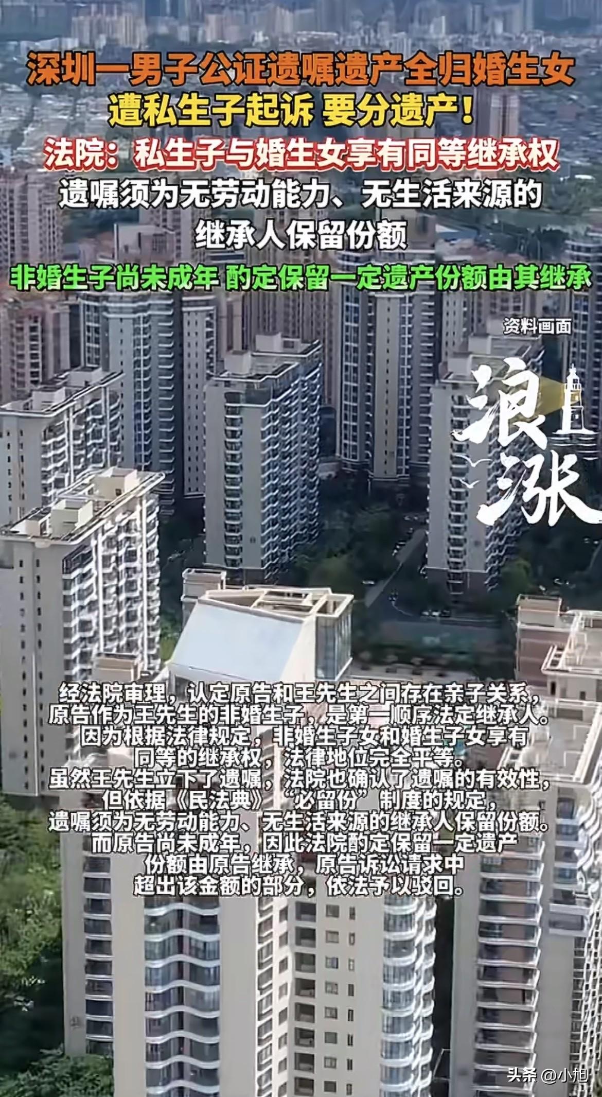 深圳王先生走了,留下一纸公证遗嘱:每年给母亲10万养老,剩下的房子车子股票存款,全给独生女儿小王。 家人都以为这事板上钉钉,手续办到一半,突然收到法院传票。 一个素不相识的人,要把他们告了。 这人说,自己是王先生的亲生儿子。 消息一出,周围邻居议论纷纷。王先生的妻子脸色铁青,手指攥着那张传票,指节发白。 她跟王先生结婚这么多年,从没听说他在外面还有别的孩子。 可原告的证据摆在法庭上,铁证如山。 一份司法鉴定意见书清清楚楚写着,王先生的父母——也就是这个孩子的爷爷奶奶,是原告生物学上的祖父母。这就意味着,从基因上说,这孩子确实是王家的血脉。 除此之外,原告还拿出了王先生生前跟他的微信聊天记录。 里面不是什么客套话,全是父亲对儿子的关心——平时嘘寒问暖,生病了问候病情,催促去看医生,点点滴滴,事无巨细。 这些聊天记录,把两人之间的父子关系坐实了。 法庭上,王先生的女儿小王拒绝配合做亲缘关系鉴定。但法官明确指出,原告已经提供了足够的证据,被告拒绝鉴定,就要承担举证不能的后果。 法院最终认定,原告和王先生存在亲子关系。 这个孩子的母亲,跟王先生2016年相识,发展成男女朋友关系。那时候王先生已经结婚了,还有一个女儿。 后来,孩子出生了。 按照民法典规定,非婚生子女和婚生子女享有同等的继承权,法律地位完全平等。所以这个孩子虽然是私生子,但跟女儿小王一样,都是王先生的第一顺序法定继承人。 也就是说,遗嘱继承优先于法定继承,这话没错。但要先确定一件事——王先生的遗嘱是不是真的有效。 法院调取了王先生2024年订立公证遗嘱的全程录像。 录像里,王先生思路清晰,表达正常,能清楚说出自己想怎么分财产。跟公证员的互动也很顺畅,没有任何被人胁迫或者神志不清的迹象。 法院认定,这份公证遗嘱是王先生真实意思的表示,合法有效。 遗嘱有效,遗产按遗嘱分配——这是基本规则。但民法典第1141条还有个特殊规定,叫“必留份”制度。 这条规定说,遗嘱必须为缺乏劳动能力又没有生活来源的继承人,保留必要的遗产份额。 原告是个未成年孩子,没有任何收入来源,完全符合这个条件。 法院最后综合考虑孩子的年龄、成长所需花费、以及王先生遗产的总价值,决定给他保留一定份额。超出这个份额的,一分不给。 也就是说,王先生想把所有财产都留给女儿的愿望,最终还是没完全实现。 回过头看这件事,真正让人心里不是滋味的,是小王。 她从头到尾都是无辜的。父亲在外面有了别人,有了另一个孩子,她什么都不知道。等到父亲走了,突然冒出一个人来跟她分遗产,她连拒绝亲子鉴定的权利都没有,因为拒绝就意味着自己输了官司。 法律保护了未成年私生子的生存权,但谁来保护婚生女的权益? 王先生的遗嘱明明写得很清楚,财产全给女儿。可就是因为那个“必留份”的规定,未成年私生子就有权分走一部分。哪怕这个孩子是婚外情生下来的,哪怕生母明知对方有家庭还要在一起。 这种事,道德上怎么评价,法律上怎么处理,两边似乎永远说不到一块去。 有人支持法院的判决,说孩子是无辜的,不能因为父母的过错让孩子没饭吃。有人替小王抱不平,说凭什么妈妈受的伤害还不够,遗产还要再分给破坏家庭的人的孩子。 怎么看这件事,你怎么想? (来源:综合深圳政法、羊城晚报、红星新闻、南方网等)