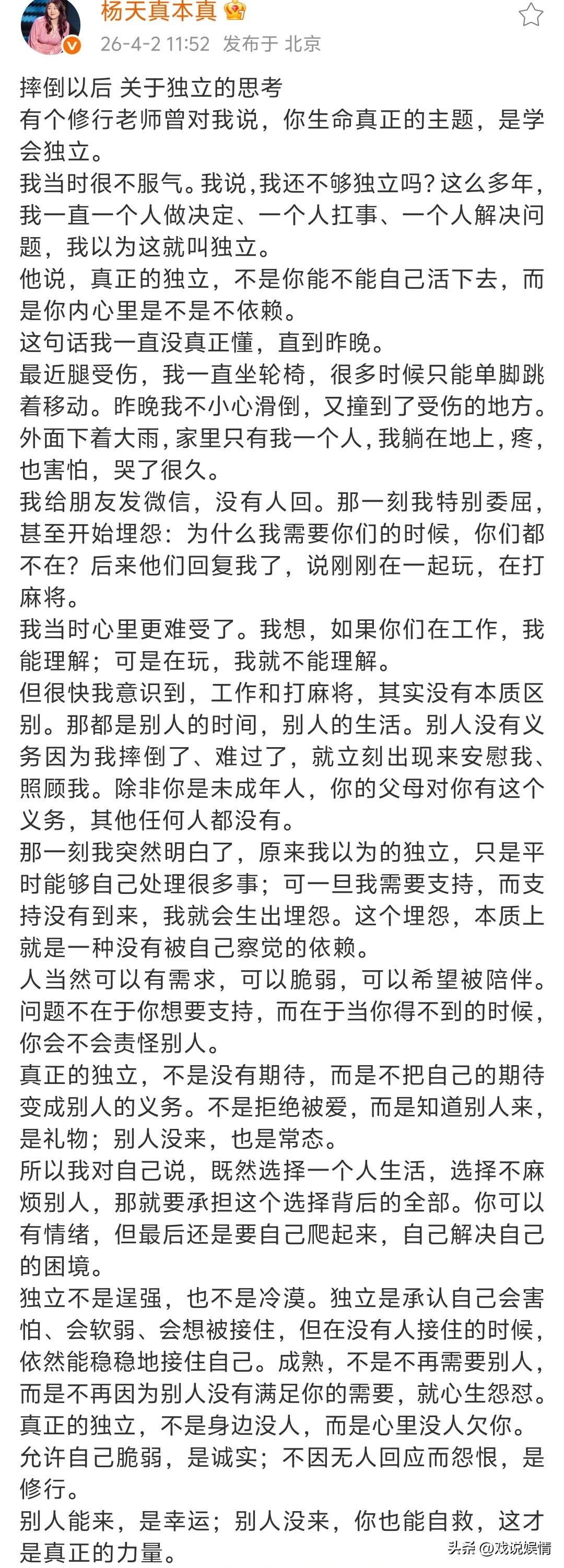 杨天真腿受伤后又在家中滑倒! 杨天真因膝盖受伤只能坐轮椅行动,4月2日,她发文透露昨晚不小心滑倒,又撞到了受伤的地方。外面下着大雨,家里只有她一个人,她躺在地上,又疼又害怕,哭了很久。 可当她给朋友们发微信求救时,朋友们因为打麻将没有及时看到。 这段经历让杨天真开始认真思考什么是真正的独立。 最后她总结道:别人能来,是幸运;别人没来,你也能自救,这才是真正的力量。杨天真确实活得太清醒、太通透了。她从不用强势伪装自己,也不刻意塑造无坚不摧的女强人形象,而是坦然接纳自己的脆弱与真实。她让我们明白,真正的强大,是允许自己柔软,是不依赖外界的肯定,不苛求他人的回应。别人来是惊喜,别人不来是常态,不向外索取,向内安顿自己,从容、自洽、笃定,这种独立又丰盈的状态,温柔又有力量,让人由衷敬佩。