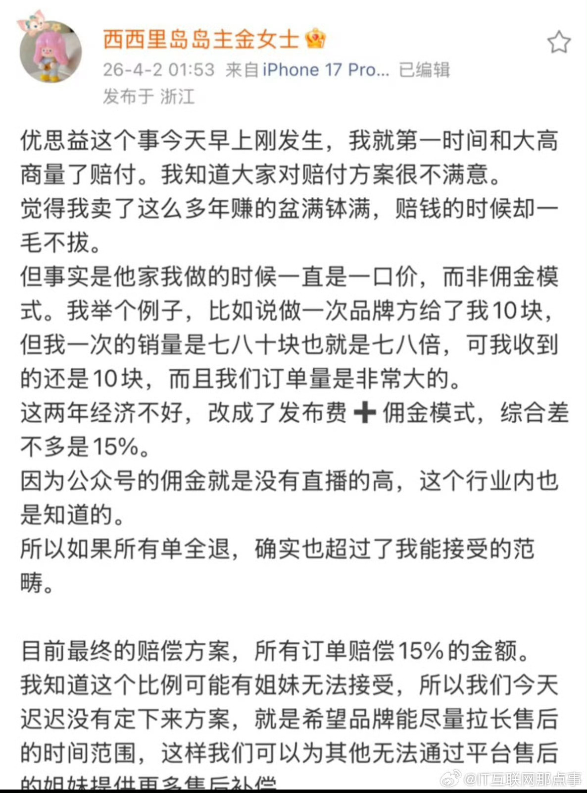 阿花花酱 优思益这么大一个博主,早就赚上亿了。。。。暴雷了仅愿意赔偿15%【 我有她好友,她坑位费➕佣金最少最少能达到35%以上。多的是50%-100%】