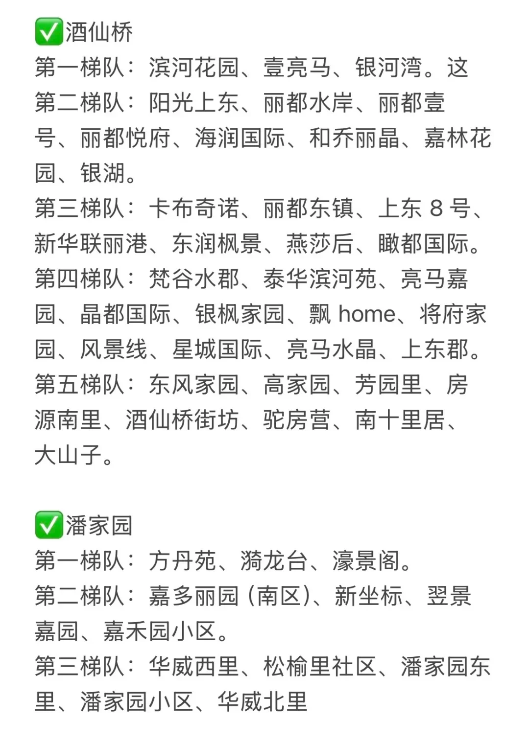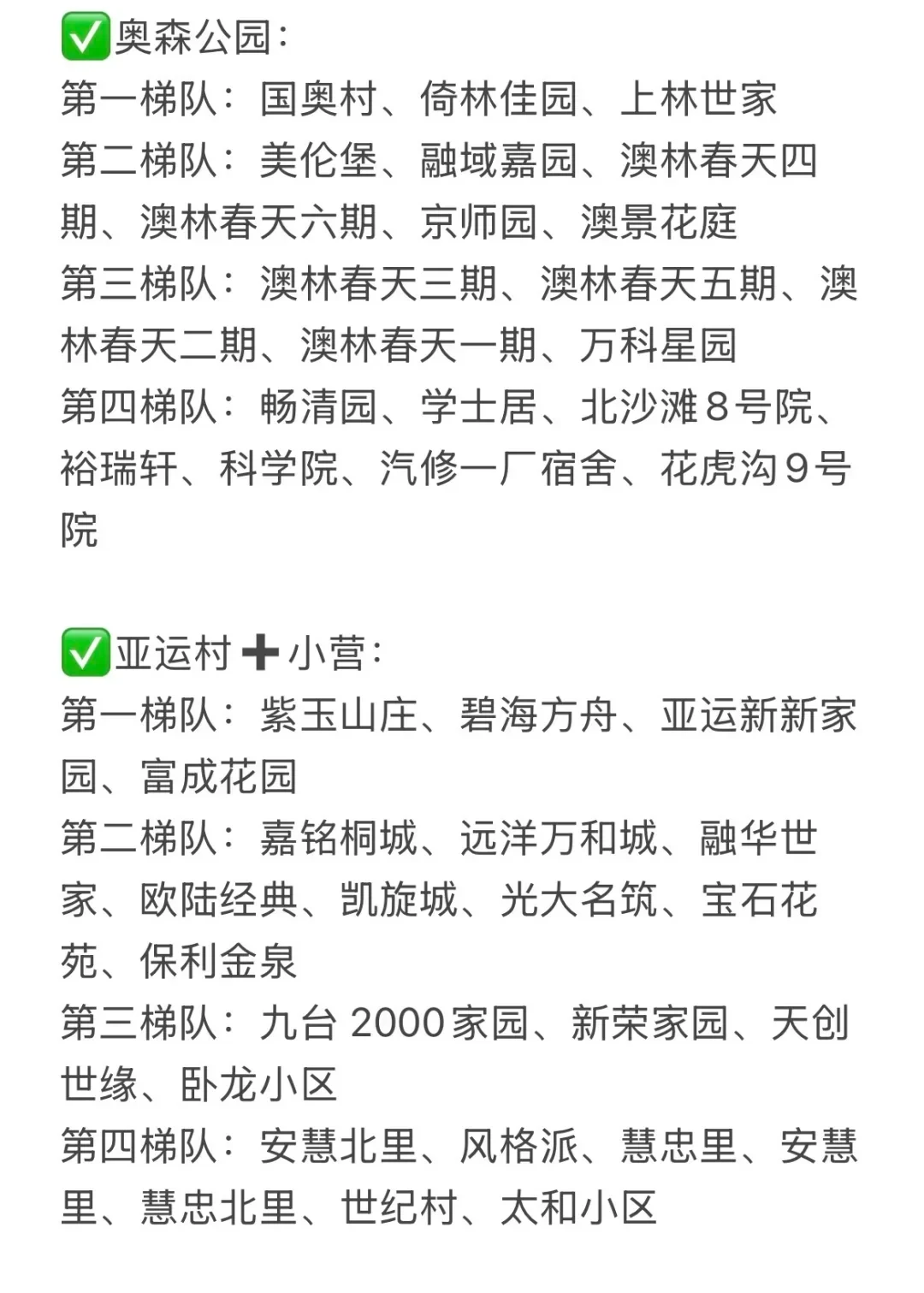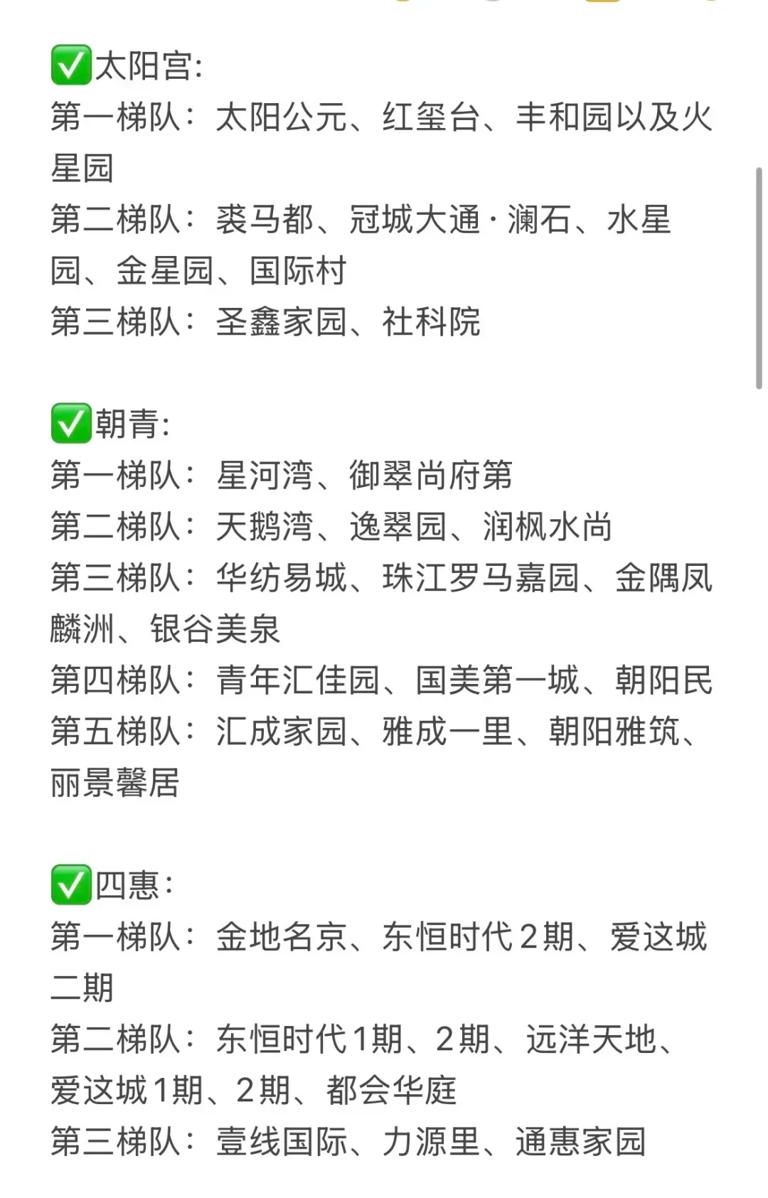 第四梯队:青年汇佳园、国美第一城、朝阳民第五梯队:汇成家园、雅成一里、朝阳雅筑、丽景馨居