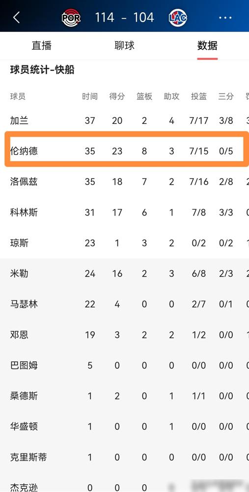 伦纳德带伤砍23分,快船五连胜被终结。 三分球5中0,全场0记三分。 手腕有伤,硬扛了35分钟。 罚球10中9,还是拿了全队最高分。 但对面霍勒迪,一个人就扔进7个三分。 开拓者全队三分投疯了,快船第二节只拿15分,直接崩盘。 伦纳德连续52场得分20+,纪录还在延续,但赢不了球。 带伤出战,是硬汉。 但篮球是五个人的运动,一个人再强,也填不上全队的坑。 你看,这就是竞技体育的残酷。 个人英雄主义很燃,但赢球,永远靠的是团队。
