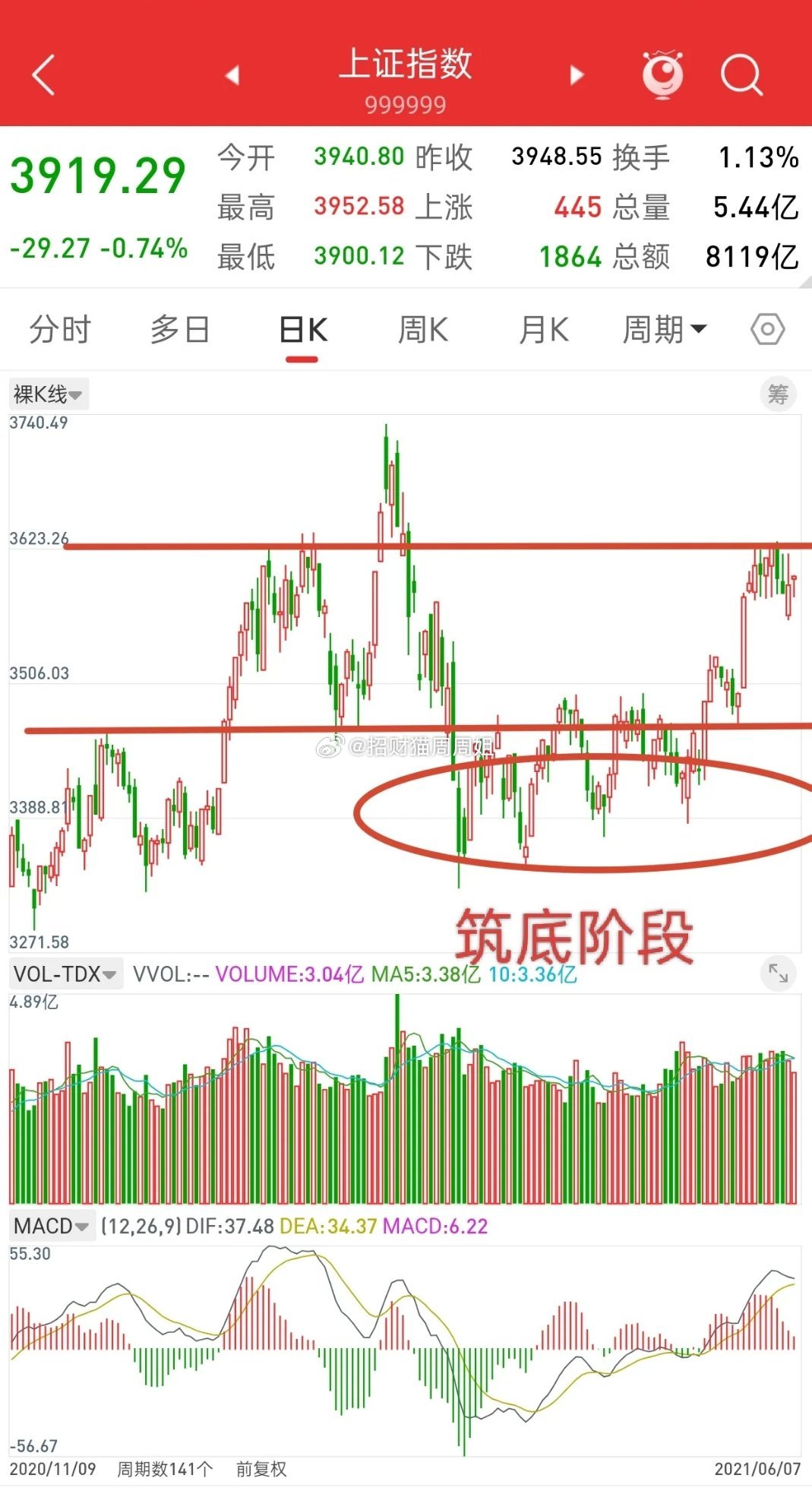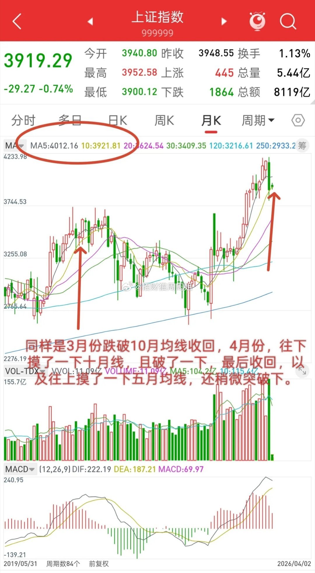 而今天也稍微破了下十月均线,这也是今天下午说3900附近是第一低吸位置,3850附近是第二低吸位置原因。