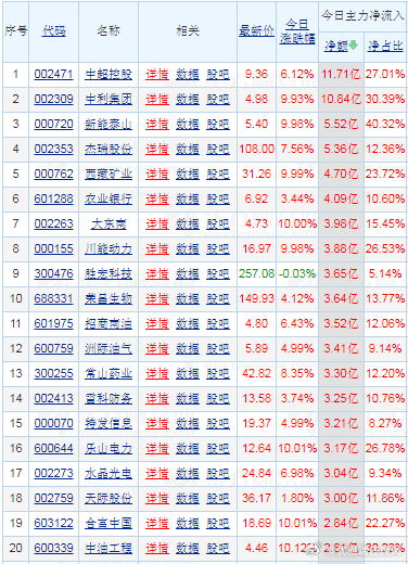 一、视野最新:主力资金:前20强股