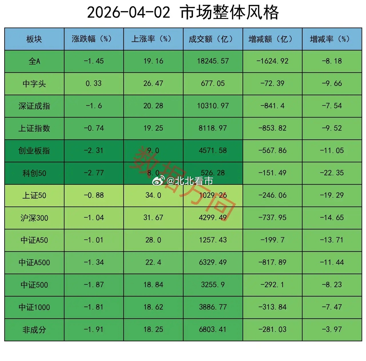 大盘低开低走、震荡下行,全A指数跌幅1.45%,仅有石油石化、农林牧渔、煤炭、银行等少数行业逆市上涨,其他行业多数下跌,个股上涨率为19%,成交额只剩1.8万亿,大幅缩减8%。