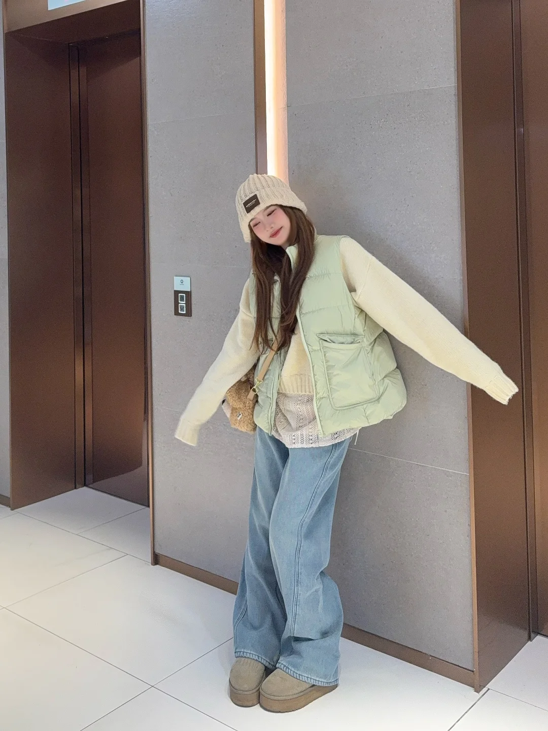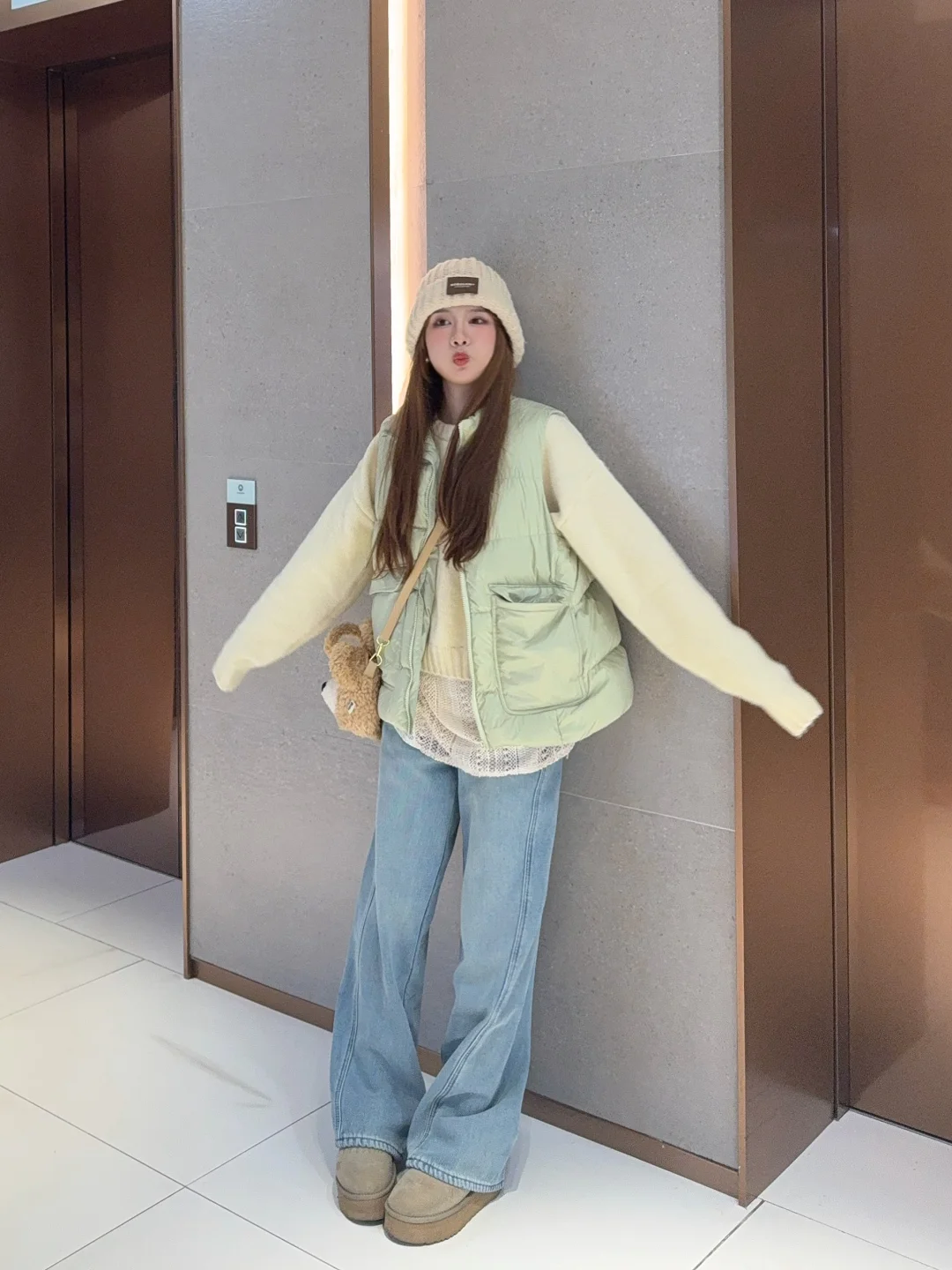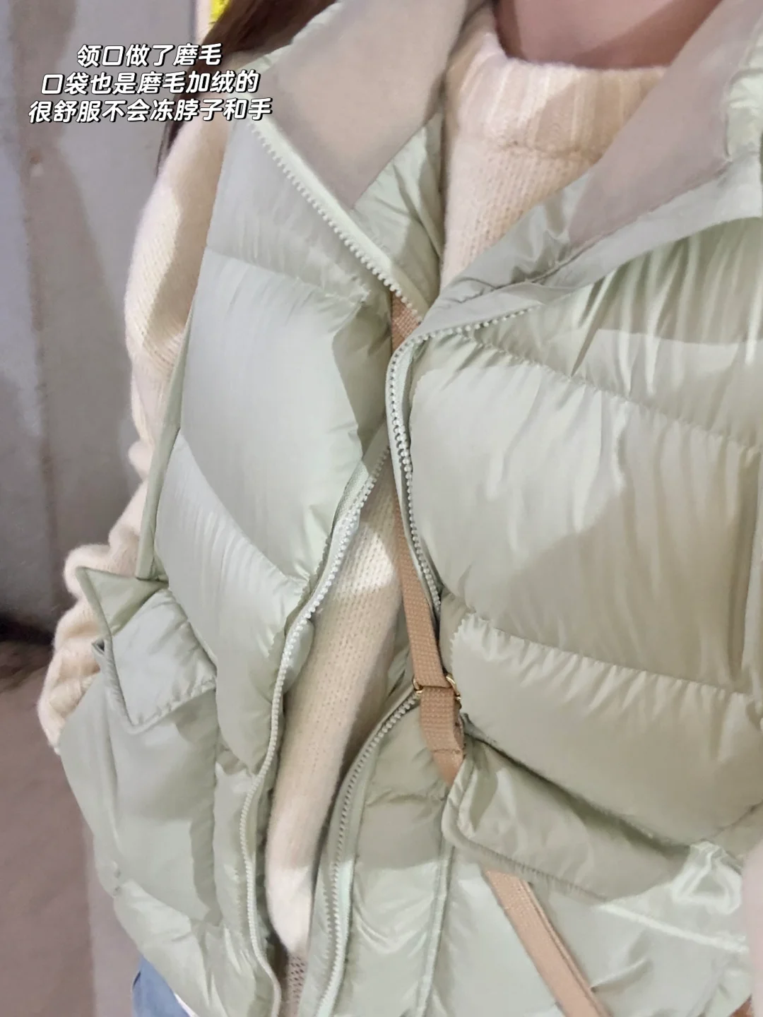 👉🏻马甲可以搭配白色棕色卡其色或者黄色的毛衣/卫衣 色系很搭很好看 羽绒马甲就是没那么实用但是又很好看