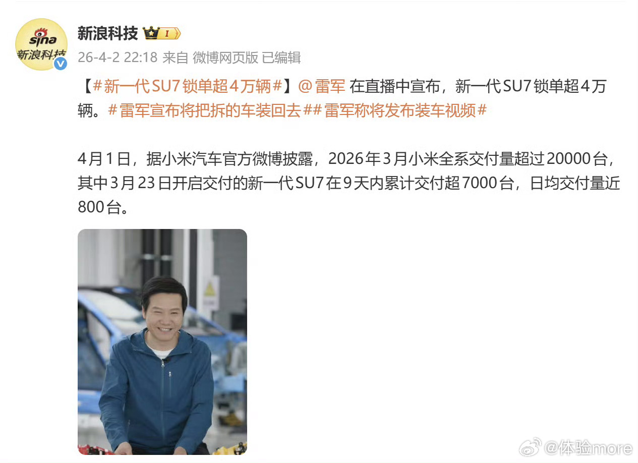 新一代SU7锁单超4万辆新一代SU7卖得挺好啊,锁单都超4万辆了。34分钟锁单超1万五千辆,3月23号锁单超3万辆,4月2号锁单超4万辆,也就是刚两周时间就卖出去超4万辆了,这是改款还不是新车型。