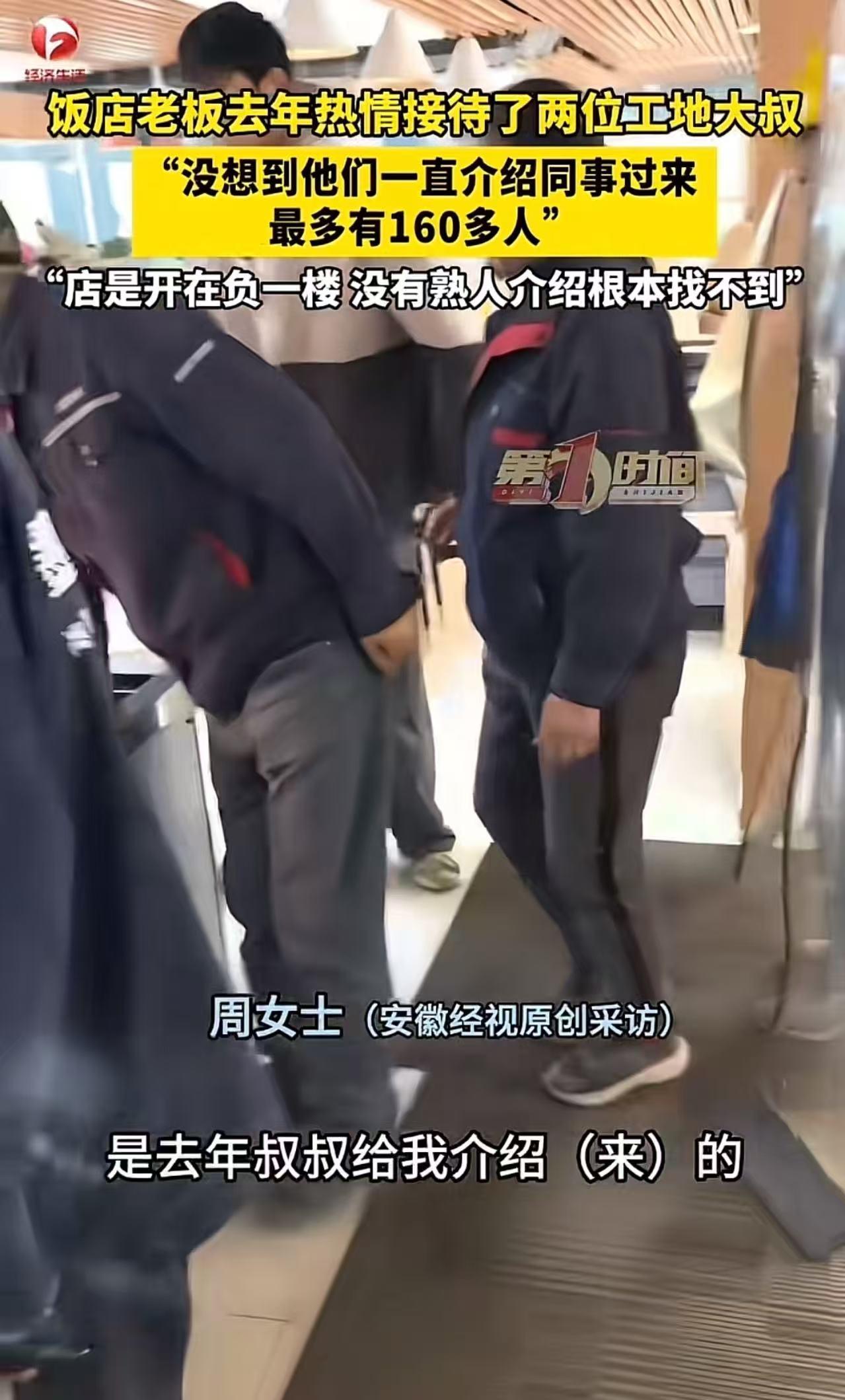 “这就是农民工的朴素和善良!”农民工怕弄脏饭店不敢进,老板一句话感动农民工大叔!之后,农民工大叔为了“报恩”,居然喊来160个工友来捧场!网友:你敬我一分真诚,我还你十分捧场,工地大叔们的这份实在太暖心了! 一家藏在地下室负一楼的小饭馆,却因为一位老板的“一句话”,火了。 故事要从去年说起。那天中午,两个皮肤黝黑、满身灰尘的农民工大叔下班后,在新工地附近寻找饭店。 他们一路走一路问,终于找到了这家饭店。 当时他们饿得前胸贴后背,可是透过玻璃往里面一看,心凉了半截。 店里窗明几净,吃饭的都是西装革履的白领,再看看自己,裤腿上全是泥点子,衣服上还沾着水泥灰。 “算了,别进去了。” 大叔拉了拉同伴的袖子,“咱这一身灰,进去别把人家地弄脏了,让人嫌弃。” 两人正犹豫着准备转身离开,饭店老板正好出来。他一眼就看穿了大叔眼里的局促和自卑。 老板没有像很多势利眼那样翻白眼,反而是一脸热情地迎上去,大声招呼道:“大哥!咋不进来?” 大叔指了指身上的灰,不好意思地说:“太脏了,怕弄脏你店里……” 老板一听,说:“嗨!这有啥?你们只管大大方方进来吃饭!我家饭店就欢迎你们农民工兄弟!地脏了能拖,人饿了可不行!” 这句话,像一股暖流,瞬间击中了大叔的心。 他们红着眼眶进了店,老板不仅没嫌弃,还特意嘱咐后厨份量打多点。 那顿饭,大叔吃得格外香,心里更是热乎乎的。 本以为这就是一次普通的偶遇,没想到,这份善意像滚雪球一样,越滚越大。 第二天,这两个大叔带了几个工友来了。 第三天,工友又带了工友。 到了后来,最夸张的一次,竟然呼啦啦来了160多号人! 整整160个壮汉,把这间藏在负一楼、平时冷冷清清的小店,挤得水泄不通。 过完年,甚至有个陌生大哥专门找来,进门就说:“老板,我是去年那个叔叔介绍来的!” 老板感动得不知道该说啥。他这店位置偏,没熟人根本找不到。 如果不是这群大哥们口口相传,这生意指不定多难做。他当初只是出于本能的一份尊重,却没想到,换来的是这群汉子最质朴、最硬核的“报恩”。 这事儿传到网上,评论区里全是点赞和感动,大家纷纷晒出自己遇到的暖心事。 有人说:“在萧山工地旁有个快餐店,老板直接挂牌欢迎工人。一开始不知道工人10点半就吃饭,三天后老板直接10点就把菜摆齐了,粥和饼还免费!第二年老板直接喜提新车!这就是好人有好报!” 有人感叹:“是真的!我们干工地的,最怕进那种装修太好的店,总觉得贵。但只要老板给个笑脸,哪怕菜价正常,我们也愿意天天去打卡!我曾经连续三个月都在一家店吃,就因为老板娘不势利!” 还有人看得很透:“其实开小饭店,老板们心里都清楚,太有钱的人事儿多、讲究多,还吃个新鲜。反而是咱们普通人,只要经济实惠、干净卫生,那就是铁打的回头客!” 看完这个故事,我心里暖烘烘的。 我们常说“人不可貌相”,但现实中,多少人戴着有色眼镜看人? 看到穿得光鲜就笑脸相迎,看到满身灰尘就避之不及。这位饭店老板的可贵之处,就在于他打破了这种世俗的偏见。 在他眼里,没有“农民工”和“白领”的区别,只有“饿了的顾客”。 他那句“我家饭店就欢迎你们”,维护的不仅仅是两个大叔的尊严,更是人与人之间最宝贵的平等。 而大叔们的反应,更是给所有瞧不起底层劳动者的人上了一课。 谁说没文化就不懂感恩?谁说干粗活的人就粗糙?这群汉子用最朴实的方式告诉我们:谁对我好,我心里跟明镜似的。你把我当人看,我就把你当恩人报! 这160人的“组团吃饭”,不是简单的消费,而是一场声势浩大的“感恩行动”。 这位老板,活该你发财!这群大叔,活该你们被尊重! 一碗热饭暖人心,一份真诚赢天下。这才是生意人该有的格局,也是中国人骨子里最动人的善良!