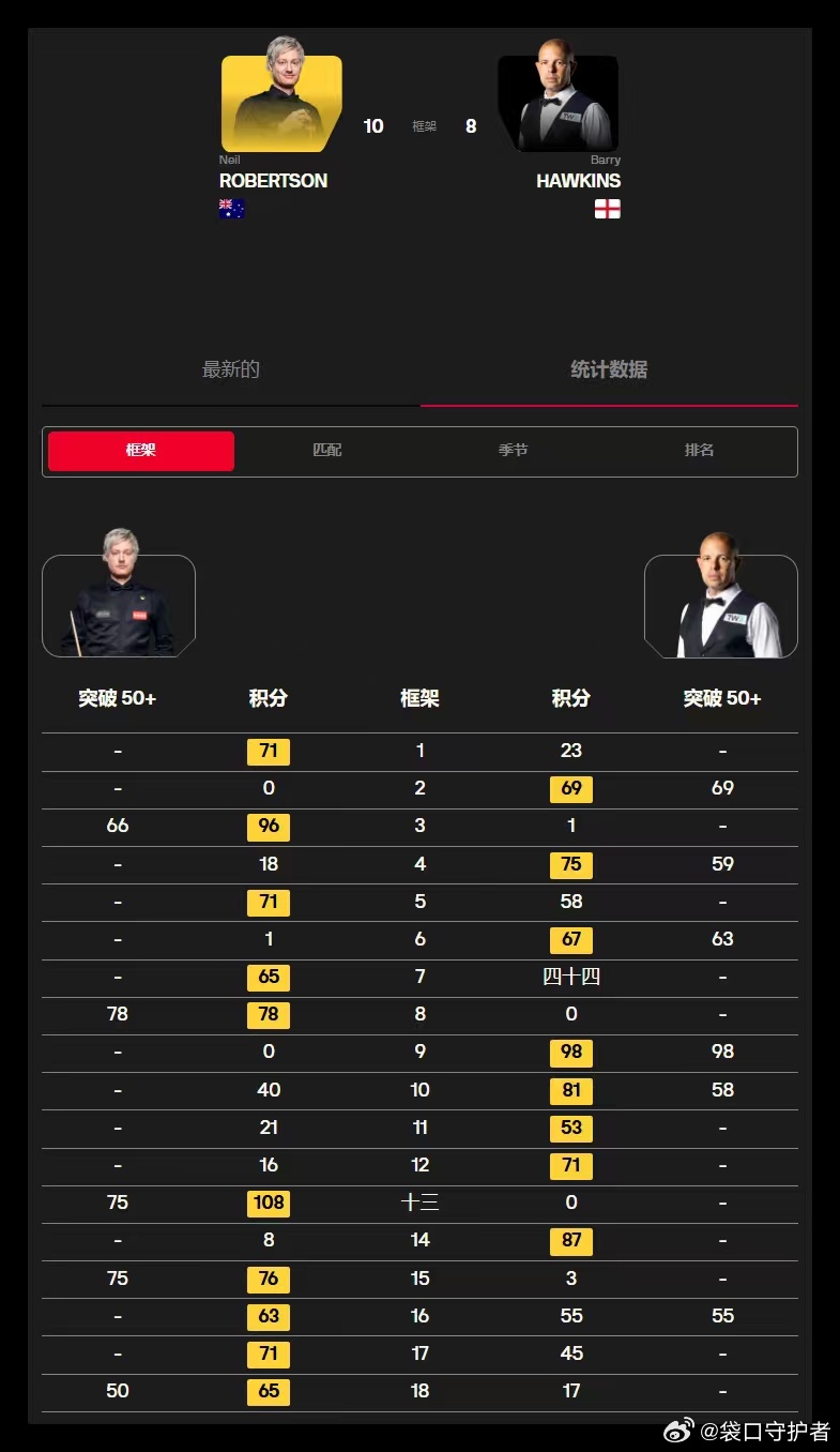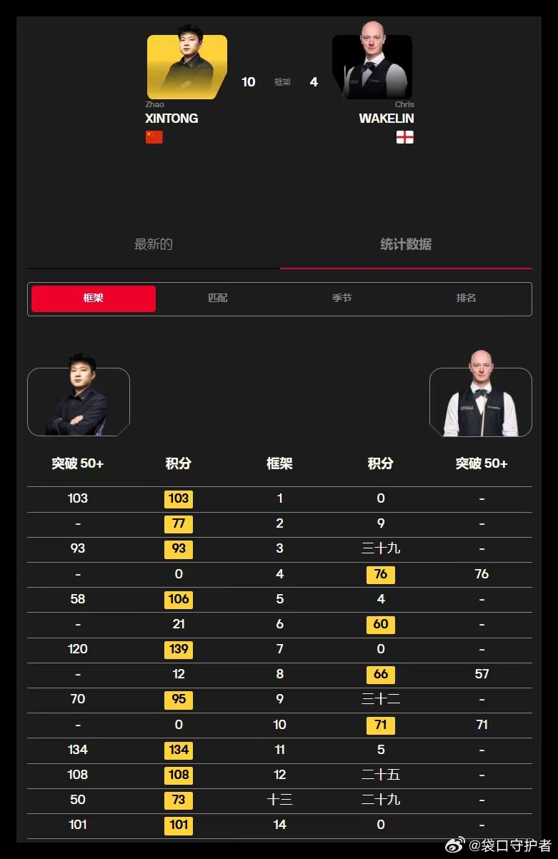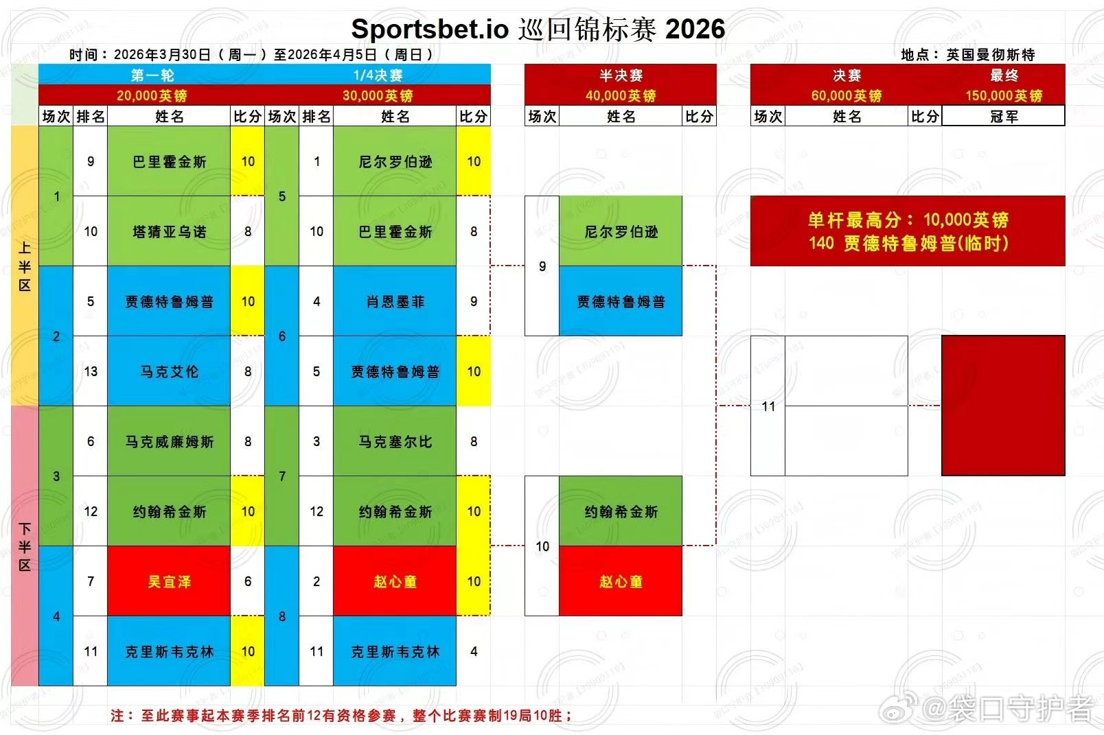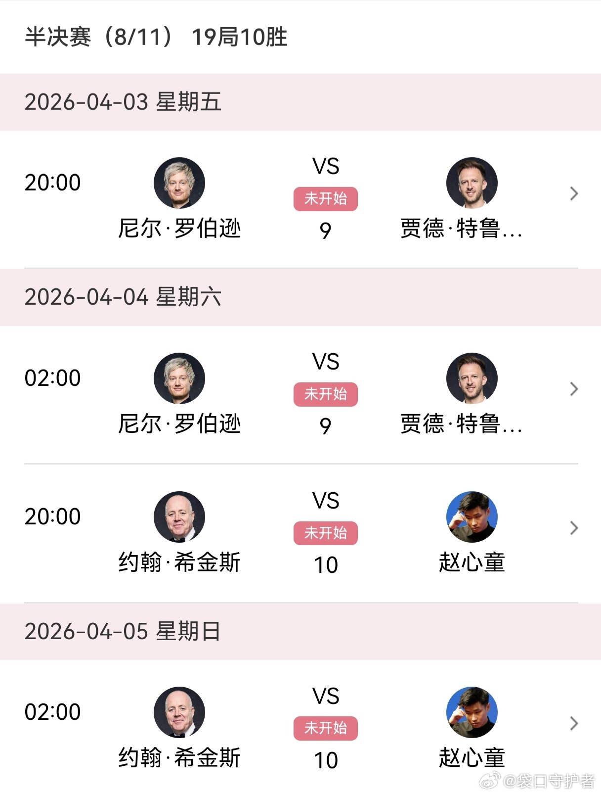 2026斯诺克巡回锦标赛第五天半决赛( 赛制11局10胜)2026.4.3日 星期四五20:00 直播: 贾德特鲁姆普VS尼尔罗伯逊 第一阶段2026.4.4日 星期六20:00 直播: 赵心童V约翰希金斯 第一阶段2026.4.5日 星期日2:00 直播:赵心童V约翰希金斯 第二阶段
