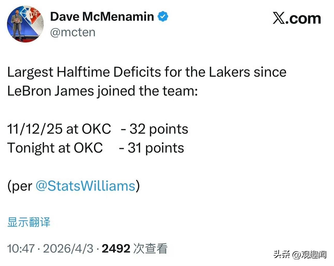 湖人被雷霆打怕了吗?打出阴影了吗 詹姆斯加盟湖人至今,上半场结束时的最大落后分差,两次都是面对雷霆,去年11月12日半场落后32分,今天落后31分。 半场的东契奇:9投2中 三分球7中1 罚球6中5,10分4篮板5助攻1抢断4失误 詹姆斯半场的詹姆斯: 3投1中 三分球1中0,得8分 湖人vs雷霆
