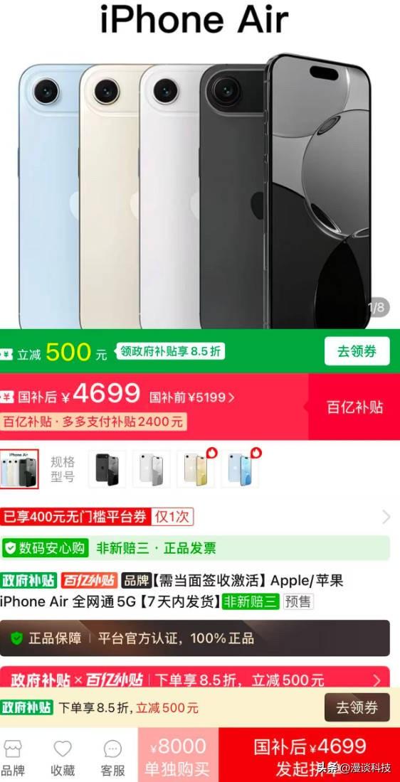 iPhone Air降到4699元了,这个价格让iPhone 17标准版都汗颜,某多百亿补贴真的太狠了,但是需要开通PDD V3会员并叠加国补。 讲真,iPhone Air除了续航和影像不大给力之外,貌似也没啥缺点了,即便有缺点,在4699元这个价格上看,已经感觉全是优点了……