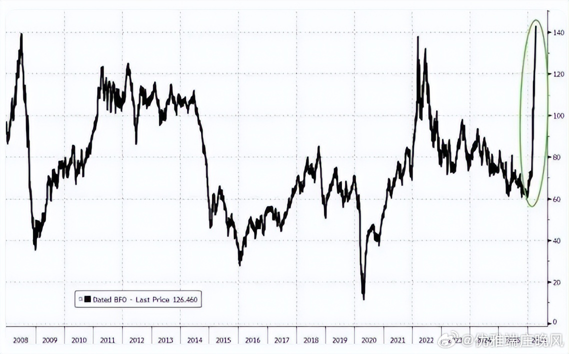 布伦特原油:现货价格:已飙升至每桶141.36美元。创下2008年:金融危机以来的最高水平 。这一价格:反映了未来10至30天内交付的原油需求。凸显当前:全球实货原油市场的极度紧缺。