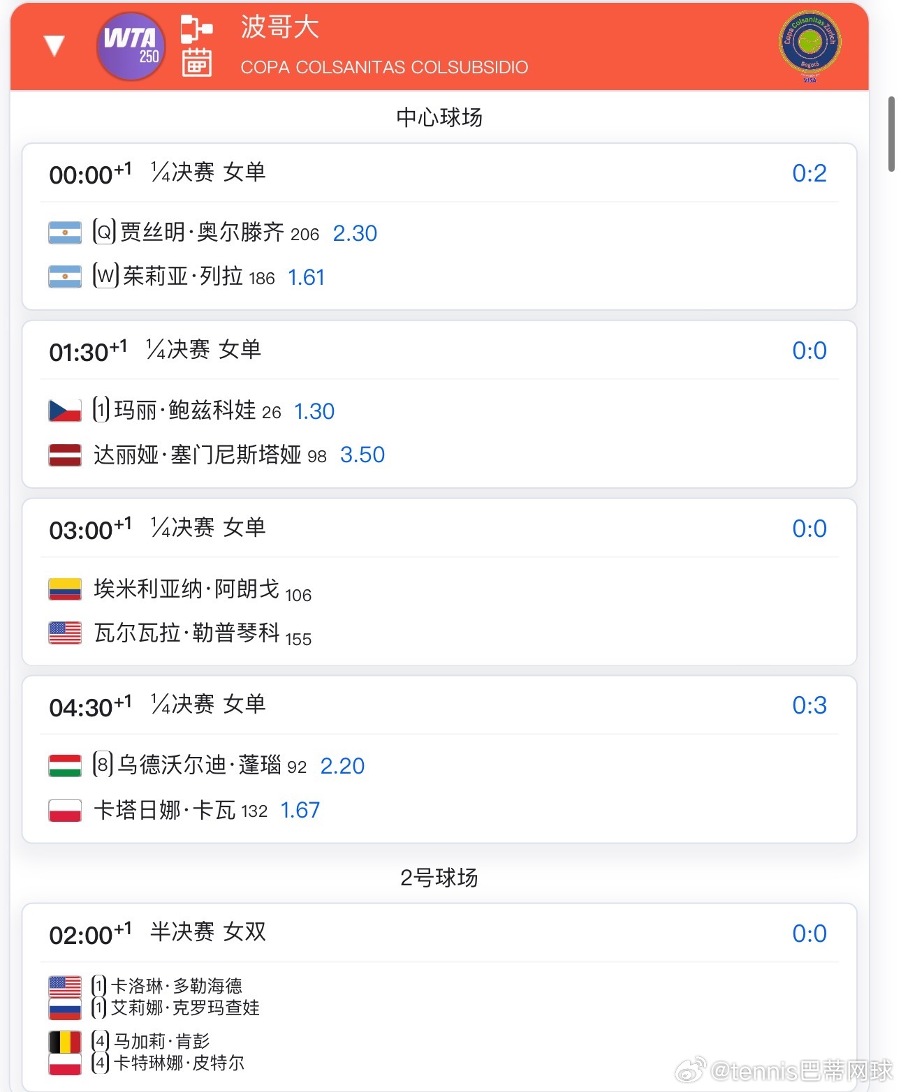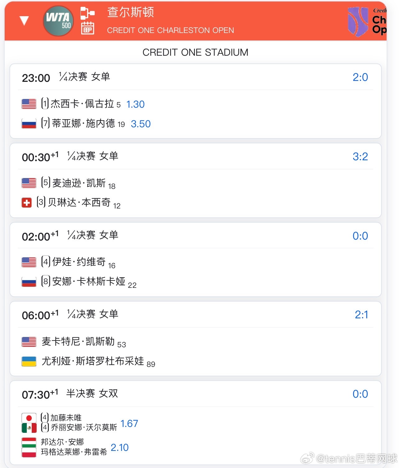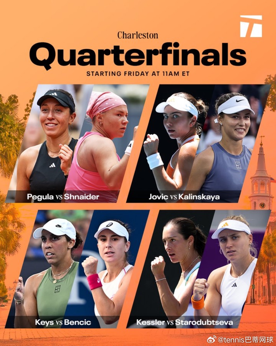 查尔斯顿八强产生,如图1,佩古拉,约维奇,凯斯,本西奇这些名将都在列;