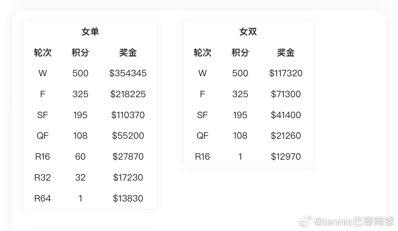 值得注意的是查尔斯顿今年第一年采用和男子500赛对等的奖金,冠军奖金高达35.43万美金💲,如图2;差不多是其他WTA500赛事奖金的两倍,真正实现了同工同酬