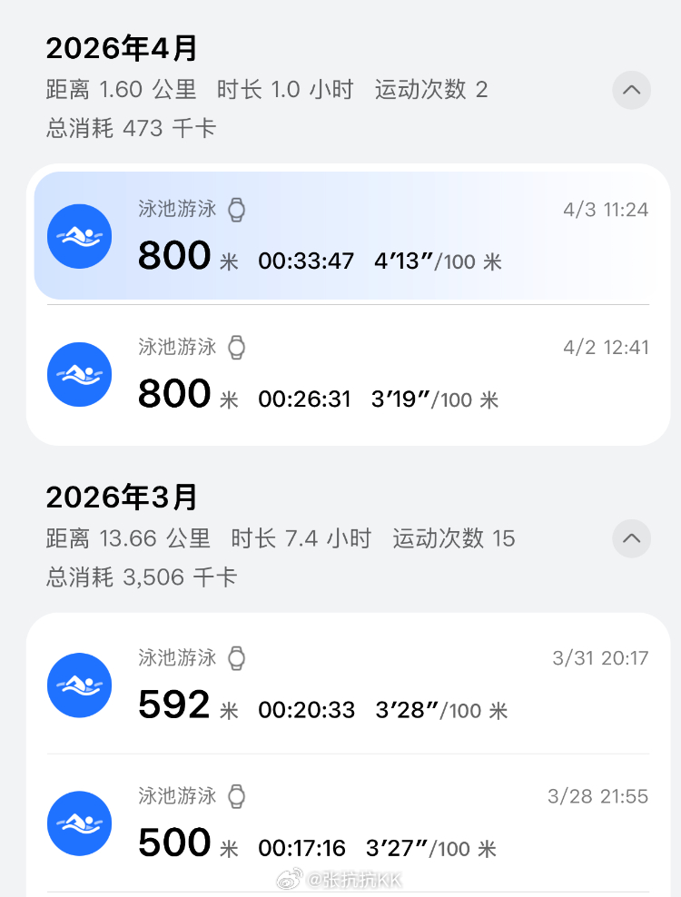 2026年第32、33、34次运动,游泳500、800、1000米【记录为800米了】。分别是在:上海金茂君悦酒店、北京望京凯悦酒店、广州朗豪酒店,分别是图1、图2、图3。