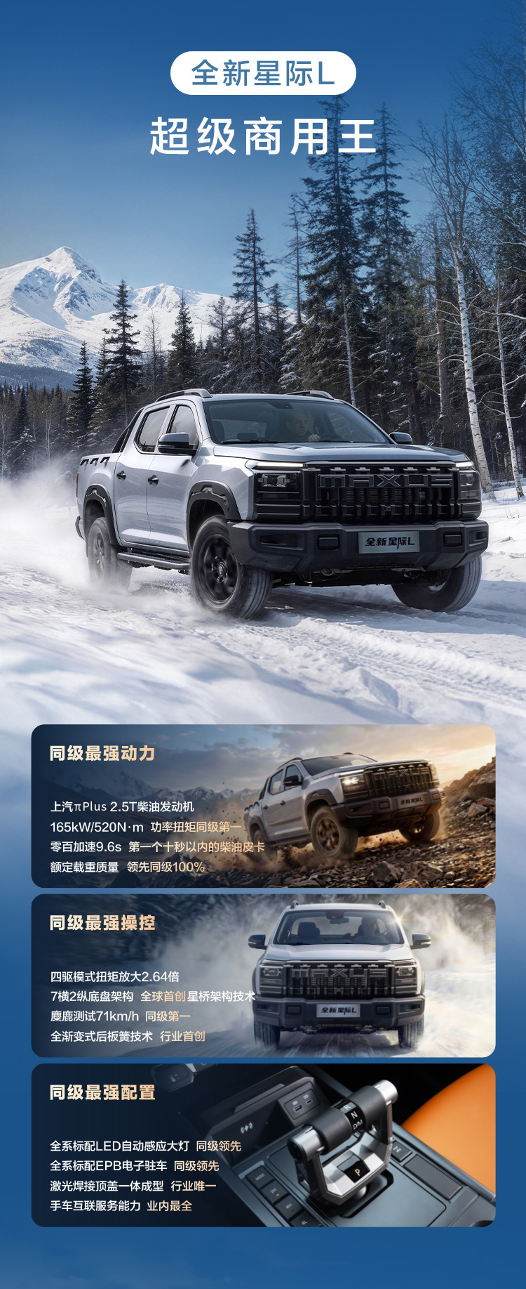 全新星际 L,硬核进阶,起售价仅 10.88 万💰动力操控全拉满,165kW/520N·m 同级没对手,额定载重超同级100%,重载也能轻松跑;4L模式扭矩可放大2.64倍,底盘采用“7横2纵”大梁结构与全渐变式板簧技术,麋鹿测试成绩达71km/h,同级第一,兼顾烂路脱困与弯道稳定性。还有全系标配LED自动大灯,车互联配置,能卷的全给卷上!
