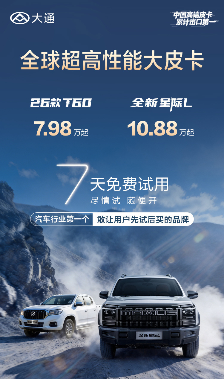 价格能打,配置更卷📈还有行业首个「7 天免费试用」玩法🎮敢拉货,敢翻山,更敢让你开上瘾!全新星际L 26款T60大通皮卡十周年全球皮卡专家全球超高性能大皮卡超级商用王实力创富王大通全新星际L上市买车先试开爽7天再下单