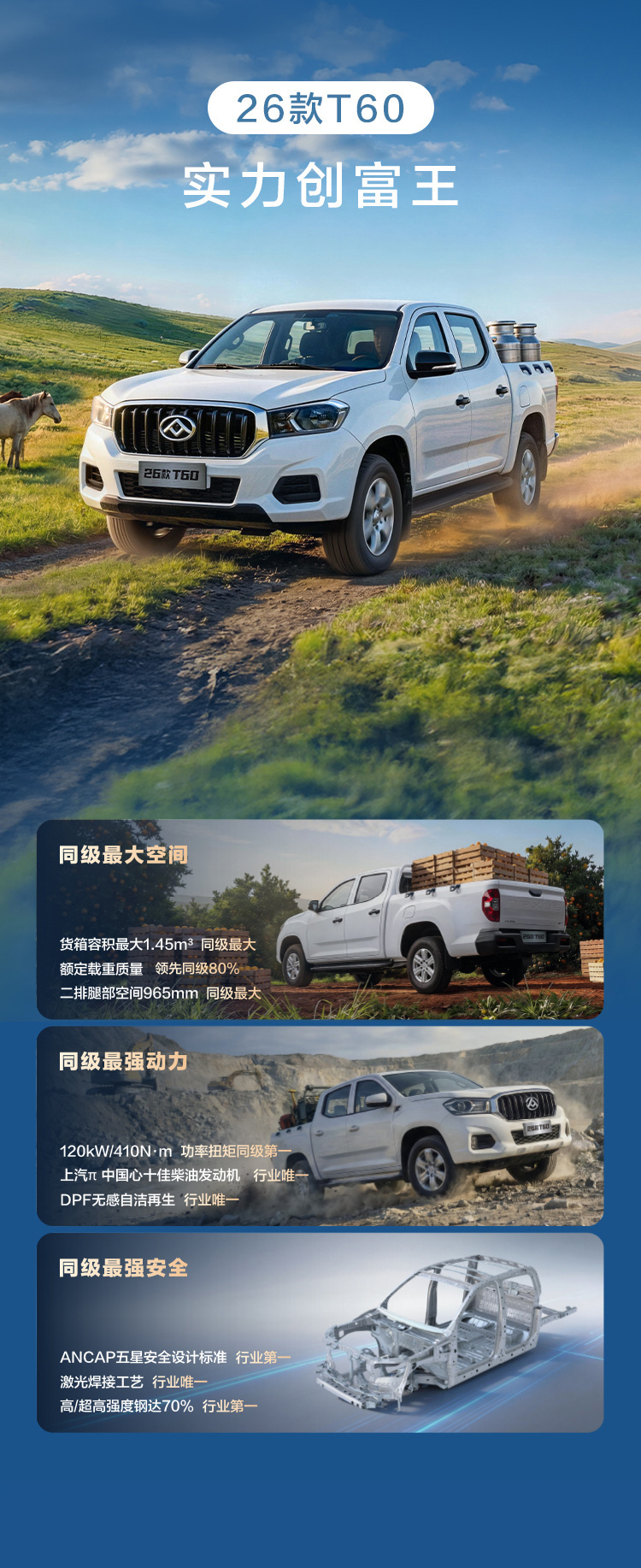 26 款 T60,实力在线,起售价 7.98 万💥作为空间安全双王者,货箱1.45m³ 同级最大,二排腿部空间965mm,装人拉货都不憋屈,更有ANCAP五星标准设计,钢筋铁骨给足安全感!