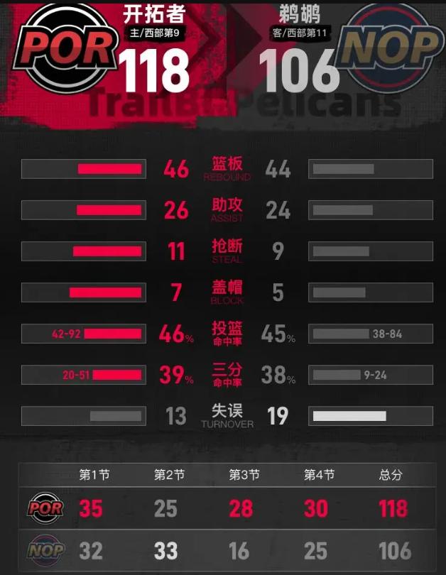 你敢信?35岁的老朱(霍勒迪)在波特兰扔进了7个三分,27分9助攻,打得像个25岁的巅峰控卫。而对面天赋爆表的胖虎(锡安),15分1篮板,在场上纯遛弯儿呢!这球看得我直拍大腿——开拓者一帮"残阵"愣是把鹈鹕给办了,118-106,送给对手六连败。天赋这东西,没血性撑着,就是裸泳。 先说这鹈鹕,纸面阵容唬人,一打就拉胯。上半场还领先4分,第三节风云突变,开拓者一波17-2的进攻高潮直接打懵。您猜鹈鹕这节拿了多少分?16分!进攻便秘,防守漏勺,典型的"习惯性崩盘"。锡安作为头牌,全场就1个篮板,跟对方中锋站一块儿都不带伸手的。说白了,这队从根上"软",没有关键时刻能咬住比分的"硬解点",逆风就散架。六连败不是偶然,是骨子里的赢球文化烂了。 再看开拓者,利拉德、格兰特、夏普全躺家里,杨瀚森还在发展联盟练级,纯草根阵容。可您再看看人家的球:老朱关键三分刀刀见血,阿夫迪亚26+8+7像个组织前锋,卡马拉23分外带4个抢断,玩命跑,玩命防。全场扔了43个三分,进了16个,硬是把天赋更高的鹈鹕给跑死了、投死了。这就是"心气"二字——打球不光靠天赋,得有股"想吃掉对方"的狠劲。 我跟您说,这球不是技战术的差距,是生存哲学的碾压。鹈鹕更衣室估计早炸了,锡安要是继续这"养生"打法,别说季后赛,附加赛都没戏。开拓者这帮人让我 respect,缺兵少将反而打出铁血。接下来的附加赛,谁碰见这支"疯狗"都得掉层皮。竞技体育,从来都不是谁天赋高谁赢,而是谁更想赢。