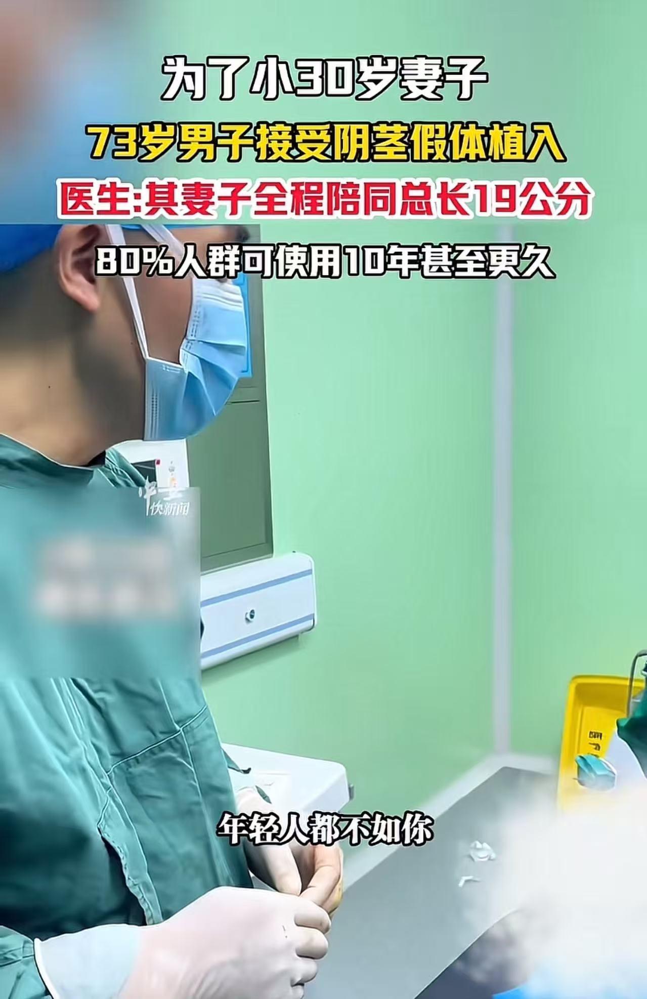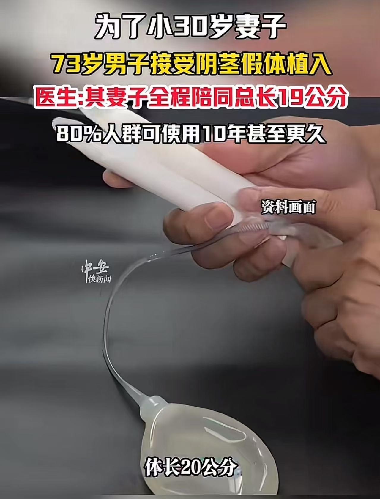 “还是大爷玩的花!”谁能想到,一位73岁的大爷,为了能让比自己小30多岁的妻子“幸福”,居然选择了去做阴茎假体植入手术!这消息一传开,网友们瞬间炸开了锅,有人调侃:“我朋友也想整一条,大概费用多少?30多岁能整吗?” 近日,武汉大学中南医院来了一位“勇敢”的大爷。手术做完后,连医生都忍不住惊叹:“体长20公分,外露13公分,这状态,好多年轻人都比不上啊!” 原来,大爷娶了个年轻貌美的小娇妻,可无奈自己“心有余而力不足”。 偶然间,大爷了解到有阴茎假体植入手术这么个办法,那是一点儿都没犹豫,直接就奔医院来了。 泌尿外科主任张新华介绍说,大爷已经有五、六年的勃起功能障碍了,之前试过药物治疗,压根儿就没啥效果。 不过呢,这手术也有个好处,它不会影响感觉,而且只要睾丸生精功能正常,输精管也通畅,大爷还是具备生育能力的。 另外,这假体质量还挺靠谱,根据材质和日常保养情况,80%的人都能用上10年甚至更久呢。 【网友热议】 “我刚刚装上,22cm的,外露15cm,总共花费15万,刚开始不适应,慢慢就好了,感谢中南专家让我重新找到了自尊,换救了我的家庭。” “以后穿裤子有没有影响?一直这样白天出门不尴尬吗?” “七十多岁了还这么有激情啊?我才40岁,跟我老婆分房睡觉到5年了!” “要我说啊,这年龄体力才是关键。就算那玩意儿再好使,没体力也白搭啊。万一干点儿啥,一口气上不来,直接‘嘎嘣’了,那可就得不偿失了。” 在我看来,大爷这行为虽然勇气可嘉,但也实在有些荒唐! 婚姻的幸福本就不该仅仅建立在生理需求上,更何况大爷这把年纪,身体机能本就大不如前,如此折腾,万一身体出了问题,最后受苦的还是自己和家人。 而且,这种过度追求生理满足的行为,也反映出了一种对婚姻本质的误解。 真正的婚姻,应该是相互理解、相互扶持,共同面对生活的风风雨雨,而不是单纯为了满足一方的私欲。 大爷与其在身体上折腾,不如多花点心思在和妻子的情感交流上,这样或许才能收获真正的幸福!