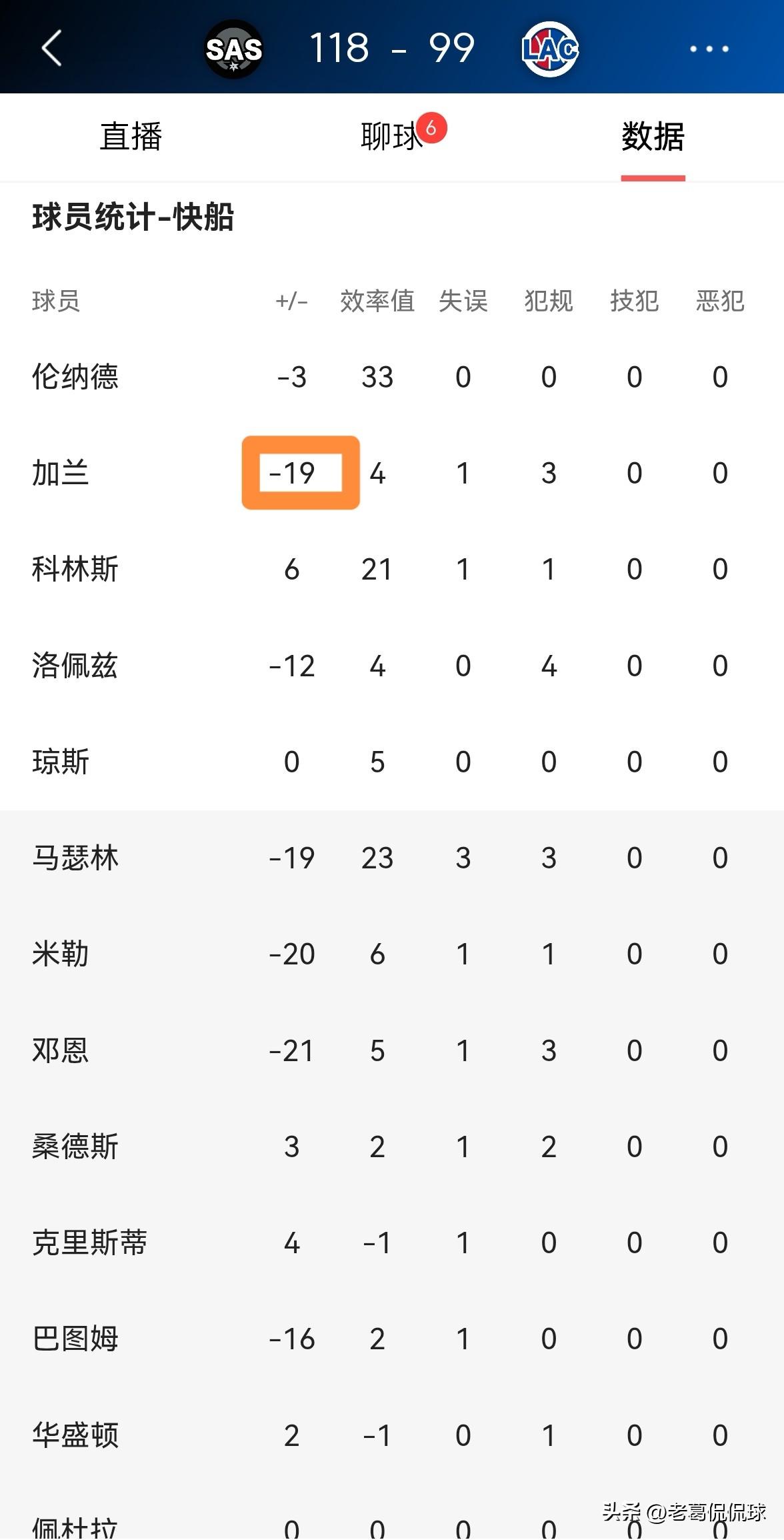 快船二当家加兰的表现真是太失常了!在今天快船主场以99:118惨败于马刺的比赛中,加兰全场比赛如同梦游一般,他在进攻端的表现实在是太失常了。 整场比赛下来,加兰首发出战29分钟,投篮17中5,其中三分球8中1相当低效的得到11分,还有3次犯规,他的场上正负值为-19。 实事求是的说,作为一名全明星后卫,这绝对不是加兰的正常水平,让人感到非常失望的是,加兰在如此重要的一场比赛中发挥失常了。