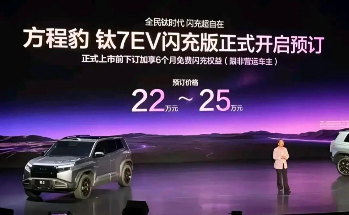 方程豹钛7纯电版,价格不可能低于20万。 105.79度电池包,标配兆瓦闪充,两驱版续航755公里,四驱版续航675公里,预售价22万~25万。 目前市面上的中大型SUV,搭载100度以上电池包,没有一款价格低于20万的。 小米YU7,96.3度电池包,25.35万。 理想i6,87.3度电池包,24.98万。 智界R7,100度电池包,26.98万。 问界M6纯电版,100度电池包,预售价28万。 方程豹钛7,最理想的起步价是20.98万,上市价格如果是21.68万,也在情理之中。 可变磁通电机,应该是不会有,天神之眼B或许有。 中大型SUV,配105.79度电池包,续航755公里,标配兆瓦闪充,10分钟就能充满电,售价不高于22万,已经很有竞争力的价格了。 那些喊20万以内的人,别想多了。
