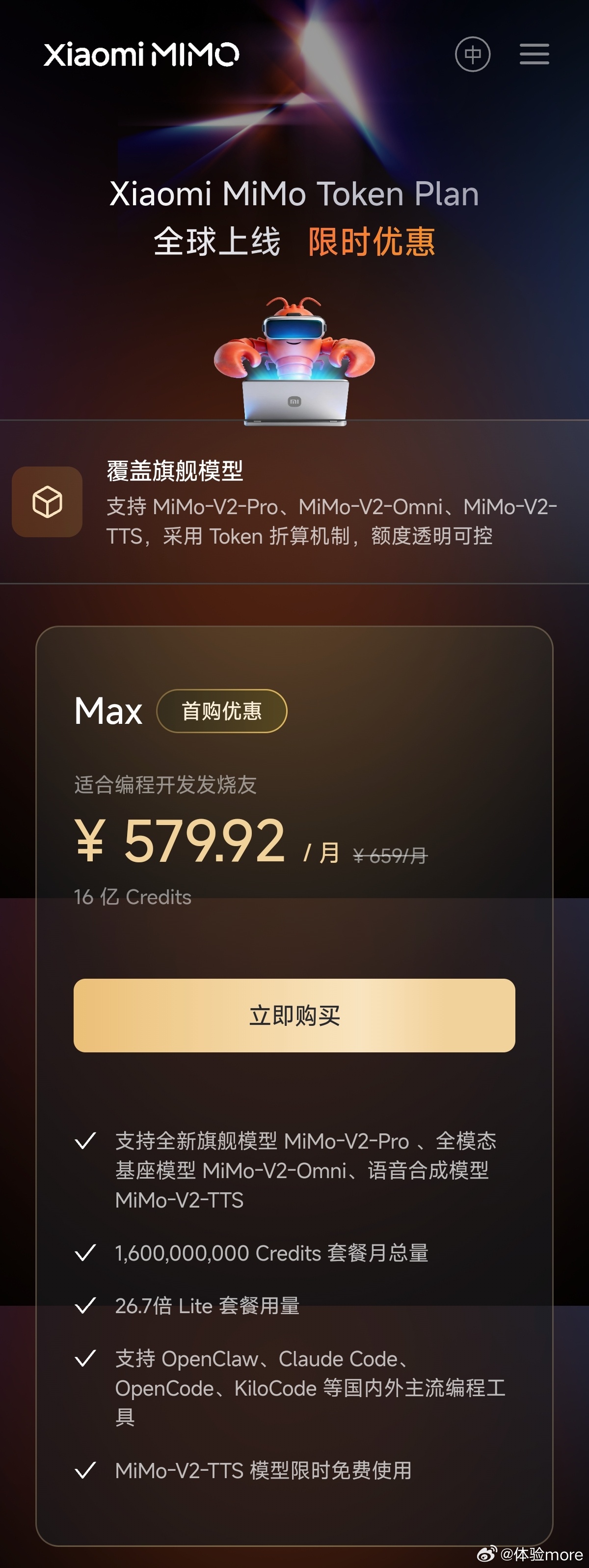 小米这个就是模型全,能力强,价格低,支持主流编程工具与模型框架,你可以用来编程、养龙虾等,挺有竞争力的。
