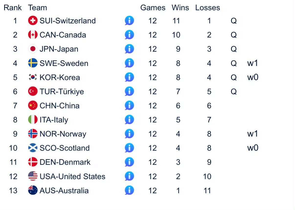 图1:2026男子冰壶世锦赛 最终循环赛排名图2:2026女子冰壶世锦赛 最终循