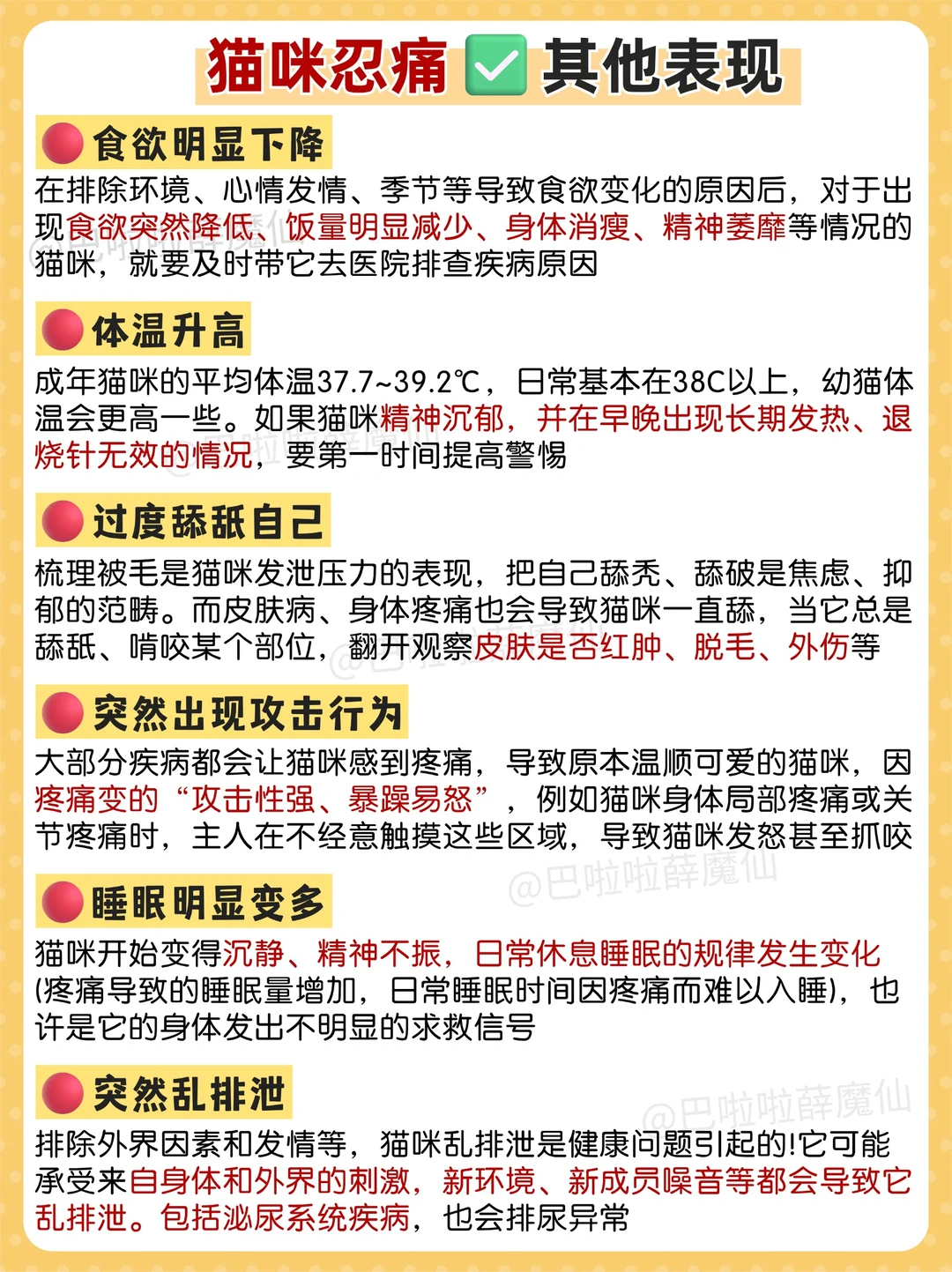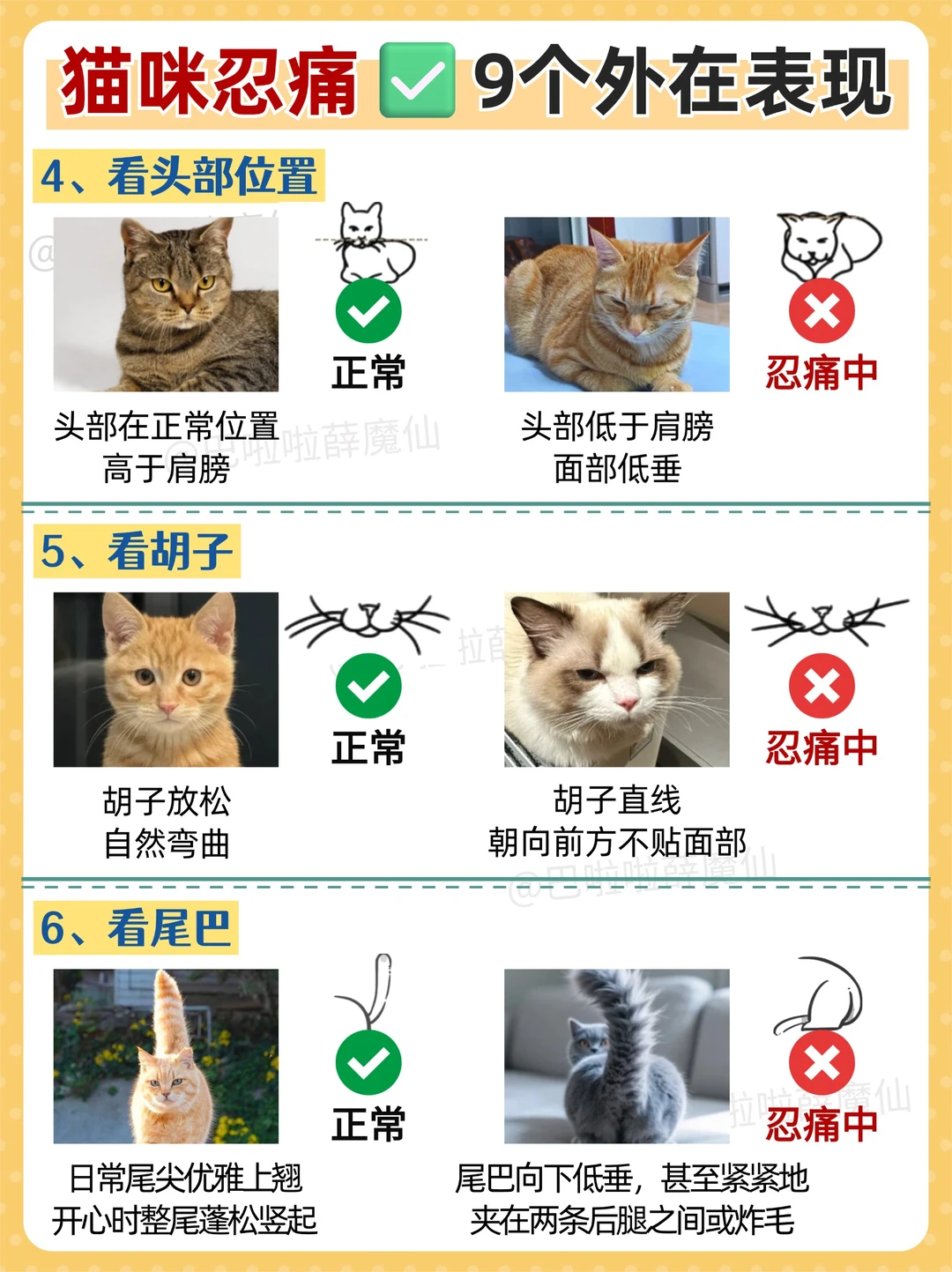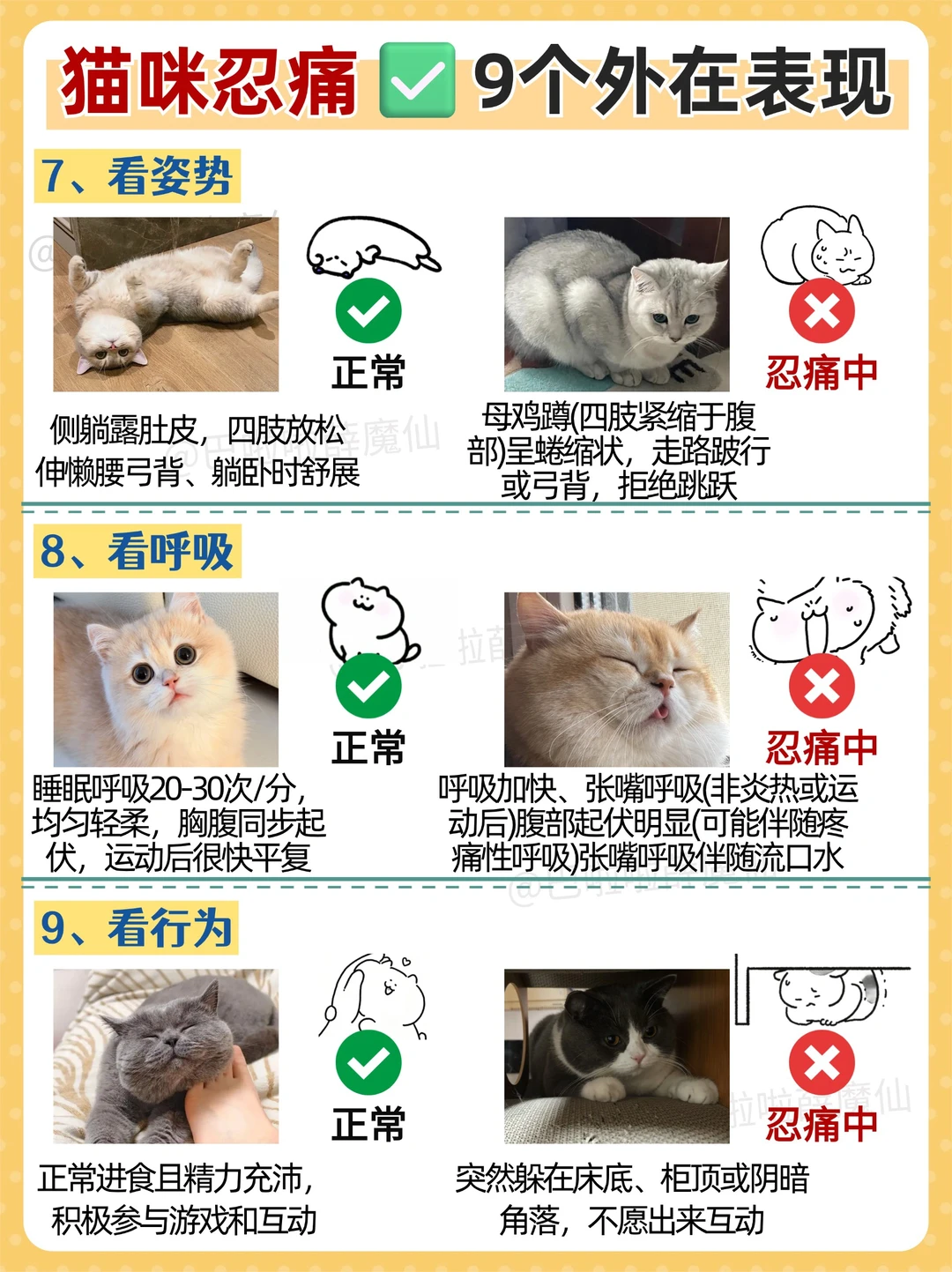 🐈猫咪是隐藏疼痛的高手,当猫咪表现出明显的疼痛迹象时,往往说明疼痛已经相当剧烈😿 👉所以我们需要在日常的接触中多留意猫咪的肢体行为,及早发现问题! ✅可以通过以下9点,观察猫咪是否不适 ①看眼睛 ②看耳朵 ③看嘴巴 ④头部位置 ⑤看胡子 ⑥看尾巴 ⑦看姿势 ⑧看呼吸 ⑨看行为 ⚠️若猫咪还有食欲明显下降、体温升高、过度舔毛、攻击行为、睡眠增多以及突然乱排泄等行为,一定要及时问医