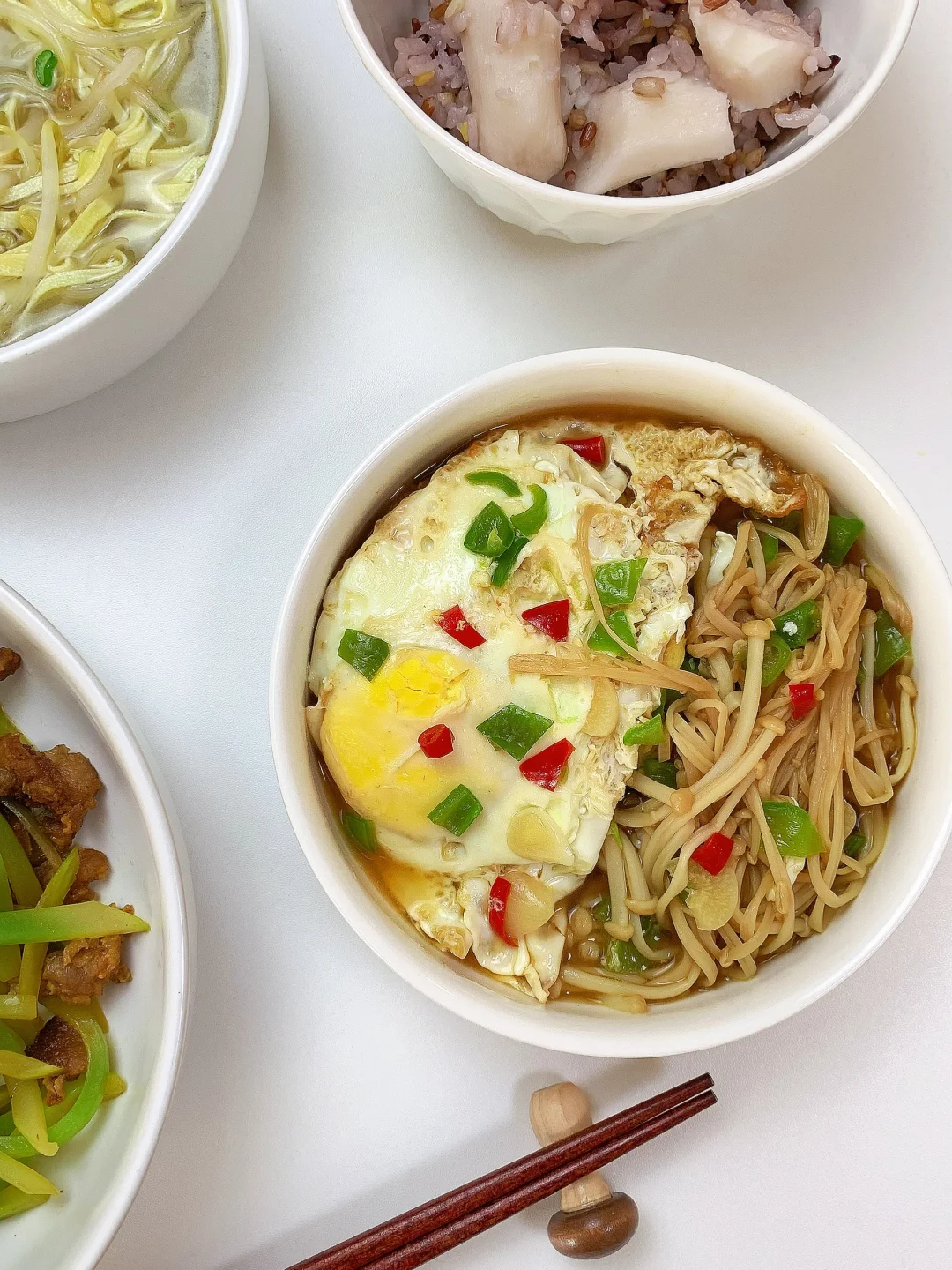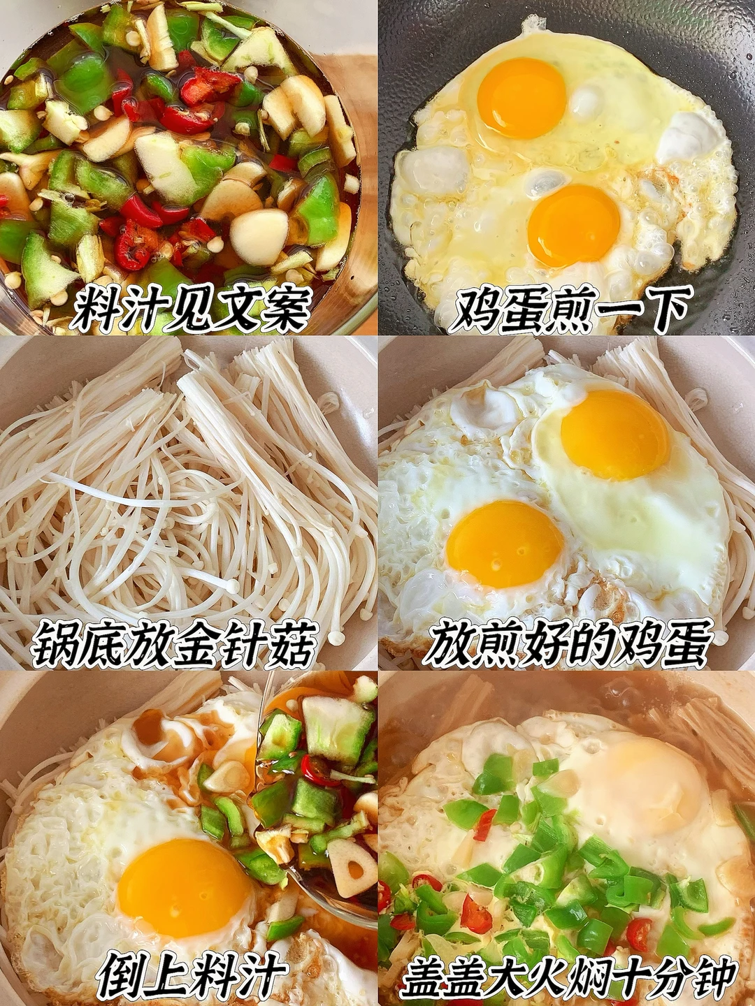 鸡蛋金针菇料汁:2勺生抽,1勺蚝油,少许盐,白糖,青红辣椒丁,蒜片,半碗清水